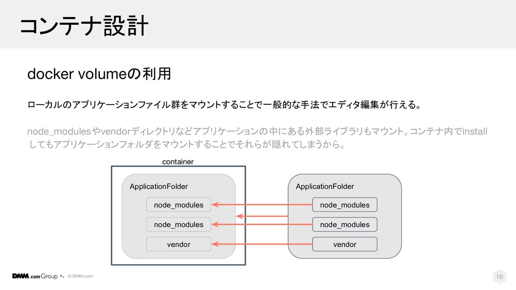 © DMM.com docker volumeの利用 ローカルのアプリケーションファイル群をマウントすることで一般的な手法でエディタ編集が行える。 node_modulesやvendorディレクトリなどアプリケーションの中にある外部ライブラリもマウント。コンテナ内でinstall してもアプリケーションフォルダをマウントすることでそれらが隠れてしまうから。 16 コンテナ設計 container
