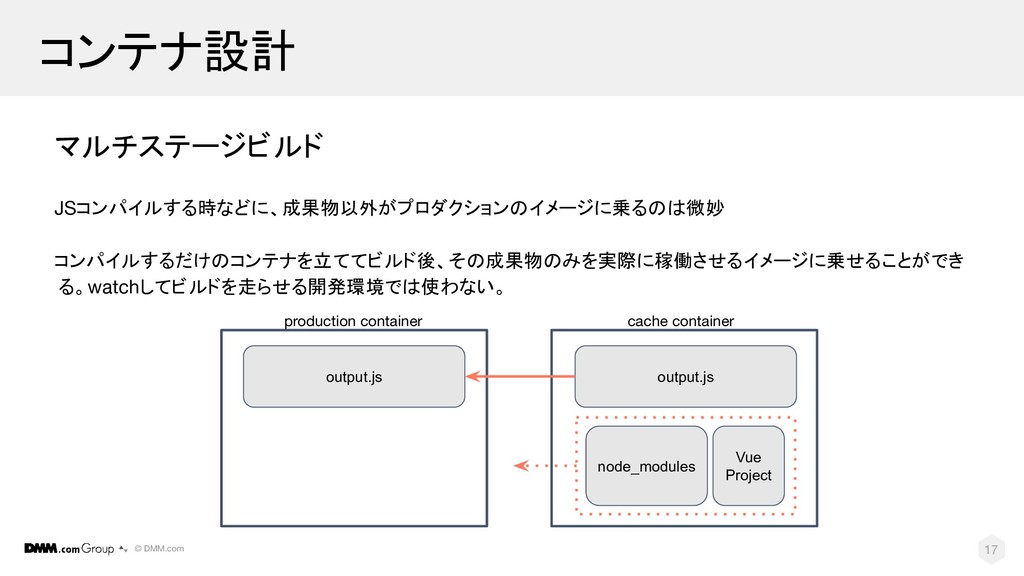 © DMM.com マルチステージビルド JSコンパイルする時などに、成果物以外がプロダクションのイメージに乗るのは微妙 コンパイルするだけのコンテナを立ててビルド後、その成果物のみを実際に稼働させるイメージに乗せることができ る。watchしてビルドを走らせる開発環境では使わない。 17 コンテナ設計 production container
