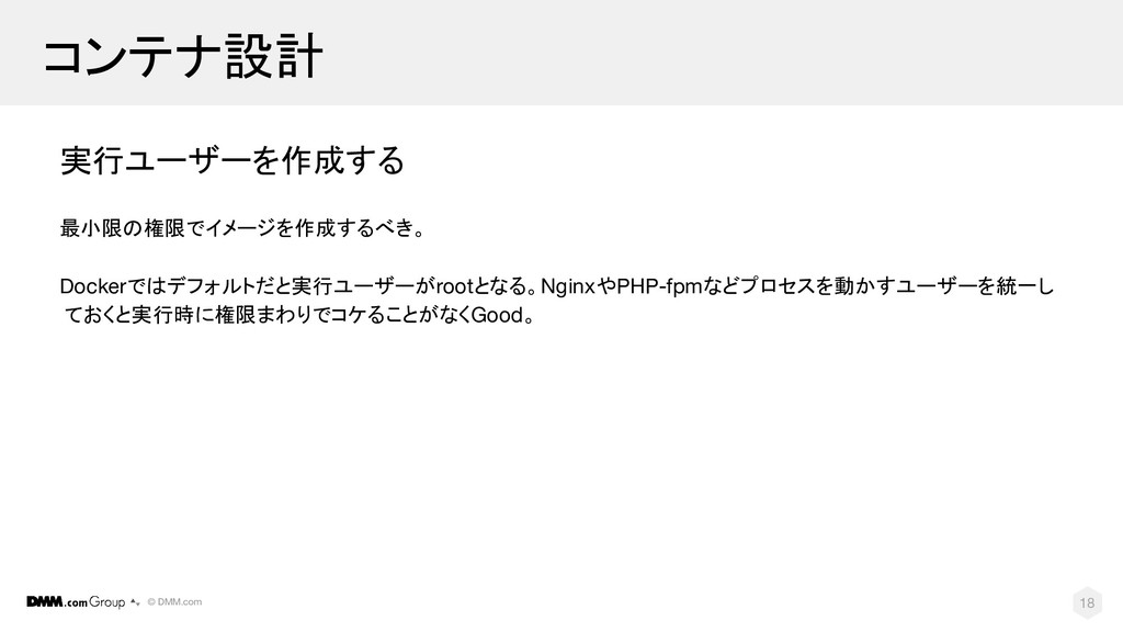 © DMM.com 実行ユーザーを作成する 最小限の権限でイメージを作成するべき。 Dockerではデフォルトだと実行ユーザーがrootとなる。NginxやPHP-fpmなどプロセスを動かすユーザーを統一し ておくと実行時に権限まわりでコケることがなくGood。 18 コンテナ設計