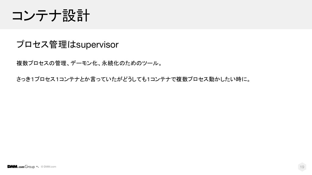 © DMM.com プロセス管理はsupervisor 複数プロセスの管理、デーモン化、永続化のためのツール。 さっき1プロセス1コンテナとか言っていたがどうしても1コンテナで複数プロセス動かしたい時に。 19 コンテナ設計