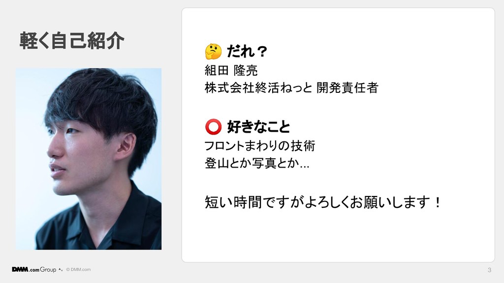 © DMM.com だれ? 組田 隆亮 株式会社終活ねっと 開発責任者 ⭕ 好きなこと フロントまわりの技術