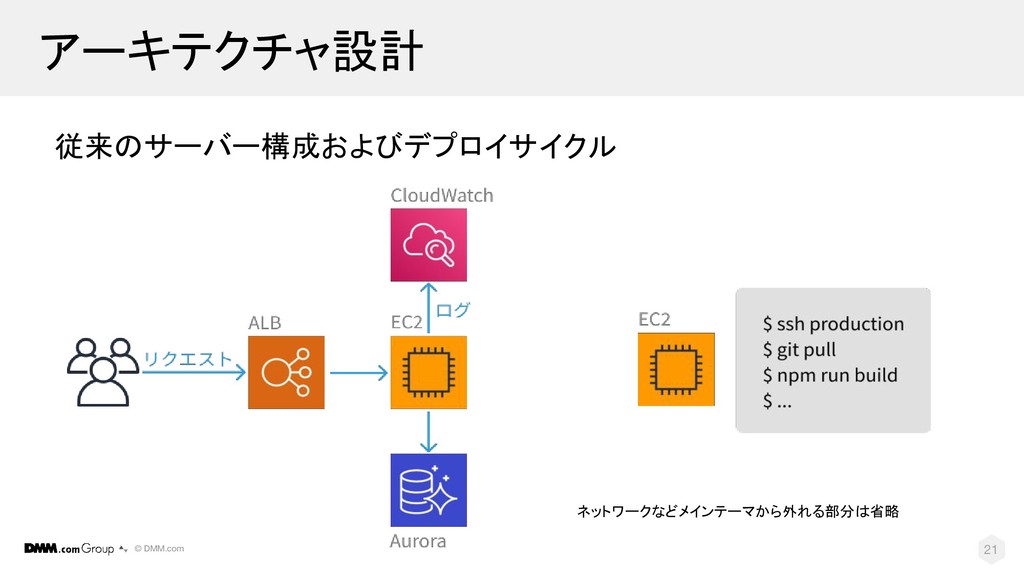 © DMM.com 従来のサーバー構成およびデプロイサイクル ネットワークなどメインテーマから外れる部分は省略 21 アーキテクチャ設計