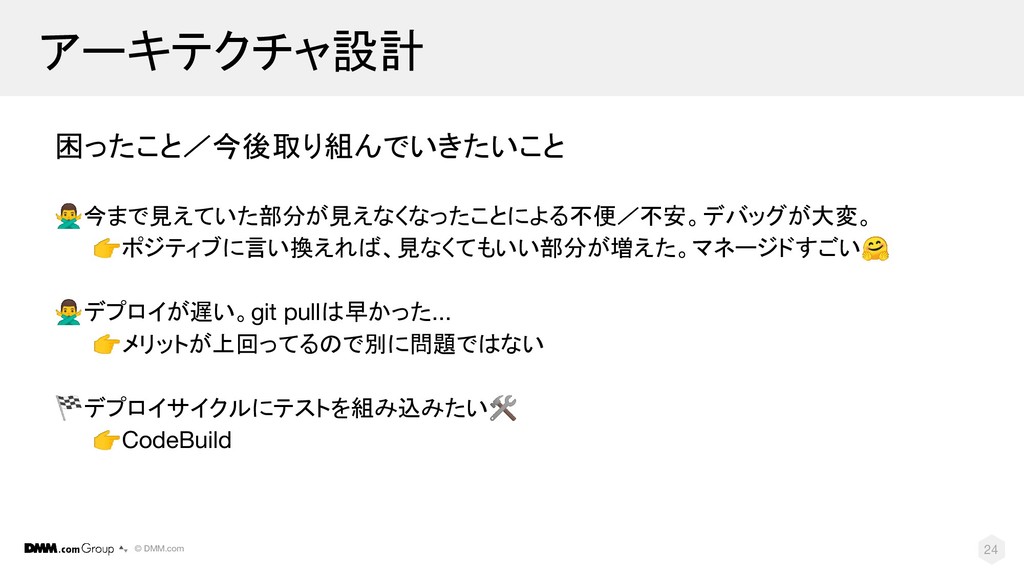 © DMM.com 困ったこと/今後取り組んでいきたいこと ♂今まで見えていた部分が見えなくなったことによる不便/不安。デバッグが大変。 ポジティブに言い換えれば、見なくてもいい部分が増えた。マネージドすごい ♂デプロイが遅い。git pullは早かった... メリットが上回ってるので別に問題ではない デプロイサイクルにテストを組み込みたい CodeBuild