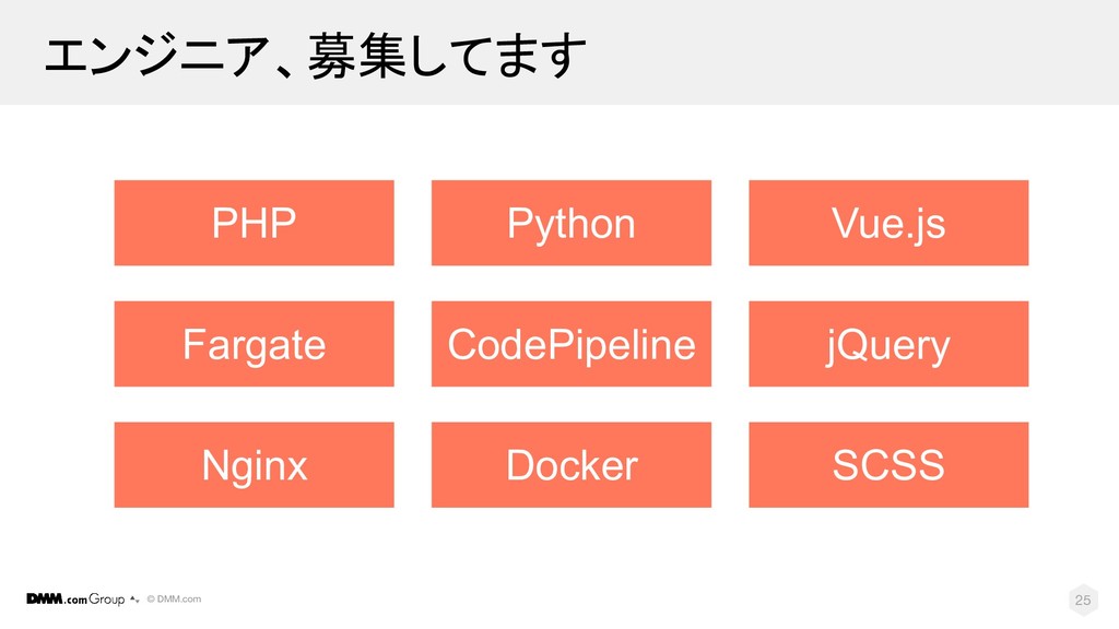 © DMM.com 25 エンジニア、募集してます PHP Python Vue.js Fargate CodePipeline jQuery