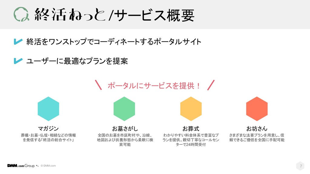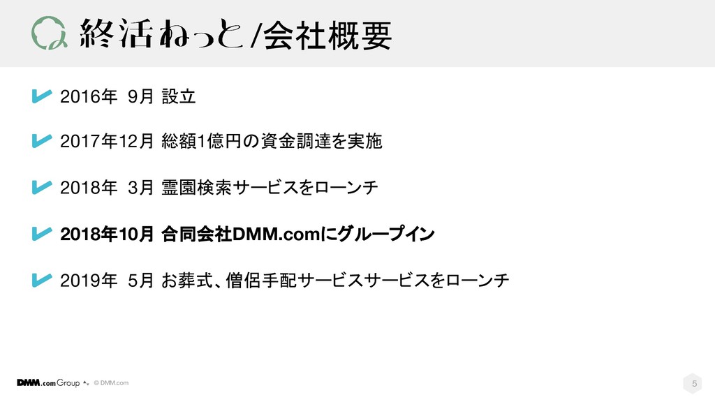 3月 霊園検索サービスをローンチ 2018年10月 合同会社DMM.comにグループイン 2019年 5月 お葬式、僧侶手配サービスサービスをローンチ