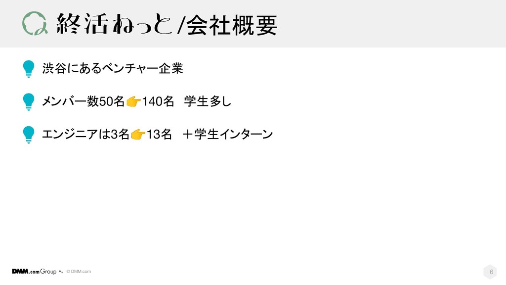 © DMM.com /会社概要 6 渋谷にあるベンチャー企業 メンバー数50名140名 学生多し エンジニアは3名13名 +学生インターン