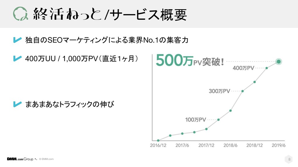 © DMM.com /サービス概要 8 独自のSEOマーケティングによる業界No.1の集客力 400万UU / 1,000万PV(直近1ヶ月) まあまあなトラフィックの伸び