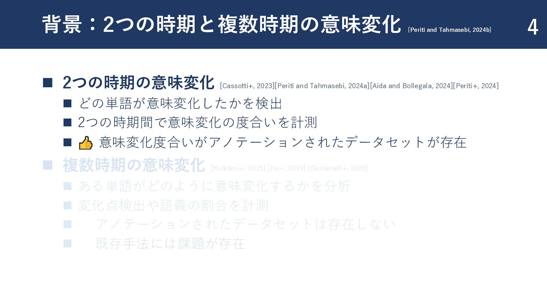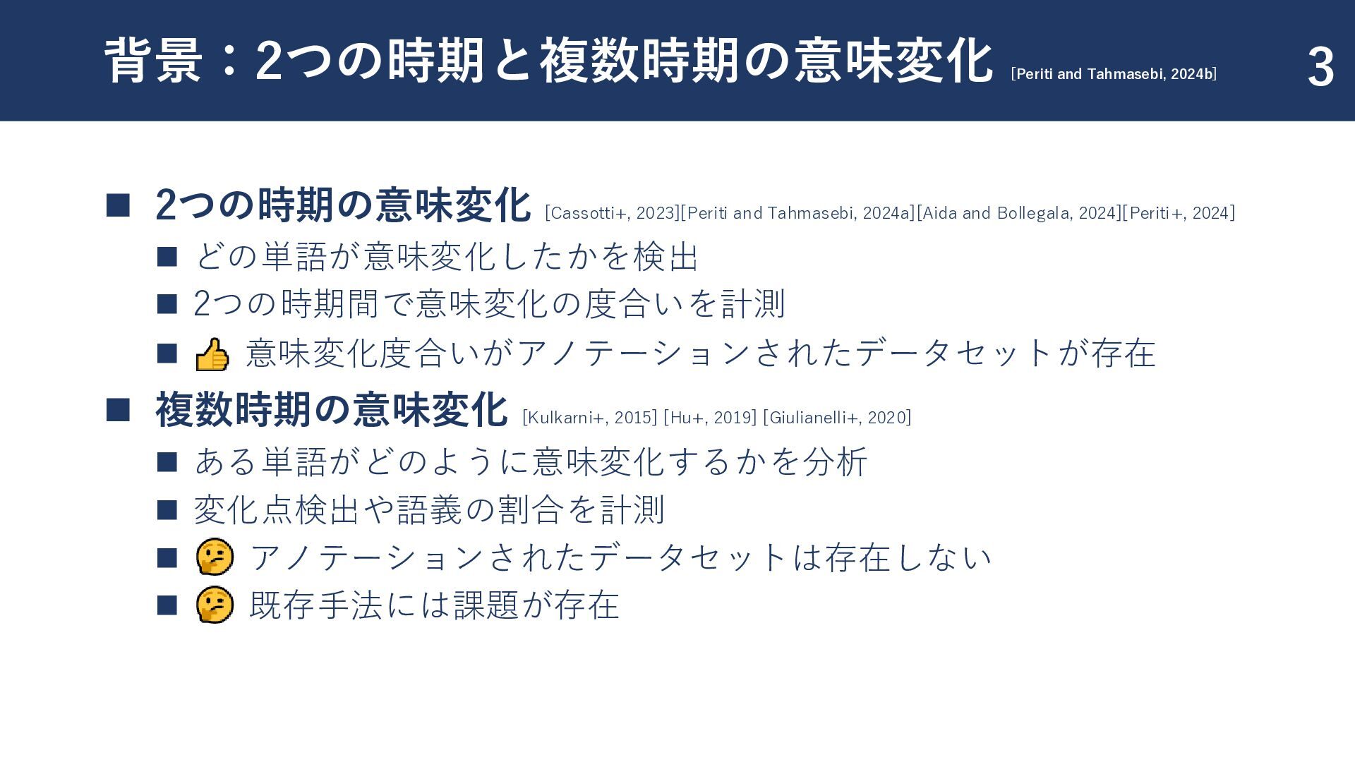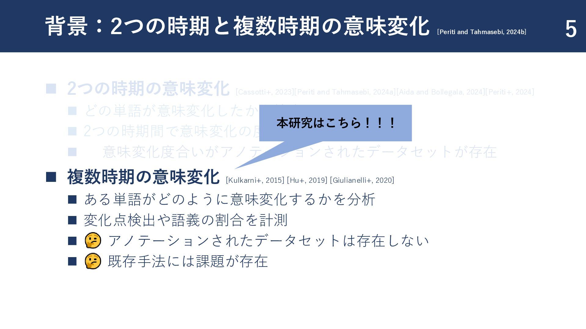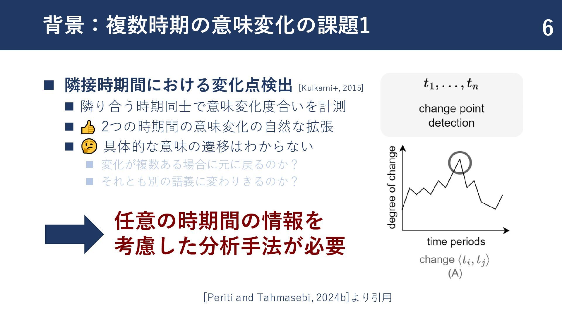 Tahmasebi, 2024a][Aida and Bollegala, 2024][Periti+, 2024] ◼ どの単語が意味変化したかを検出 ◼ 2つの時期間で意味変化の度合いを計測 ◼ 意味変化度合いがアノテーションされたデータセットが存在 ◼ 複数時期の意味変化 [Kulkarni+, 2015] [Hu+, 2019] [Giulianelli+, 2020] ◼ ある単語がどのように意味変化するかを分析 ◼ 変化点検出や語義の割合を計測 ◼ アノテーションされたデータセットは存在しない ◼ 既存手法には課題が存在 5 本研究はこちら!!!