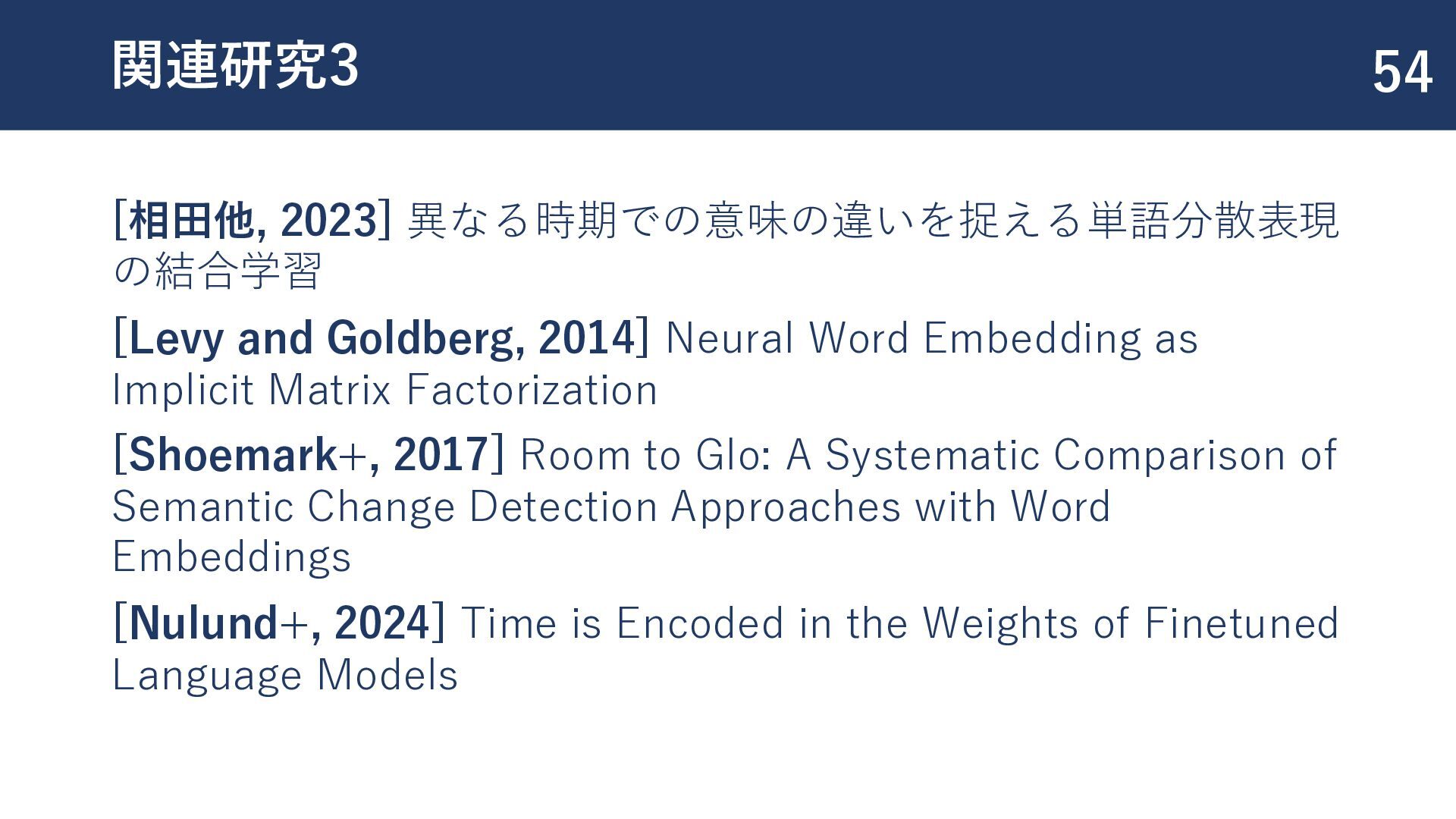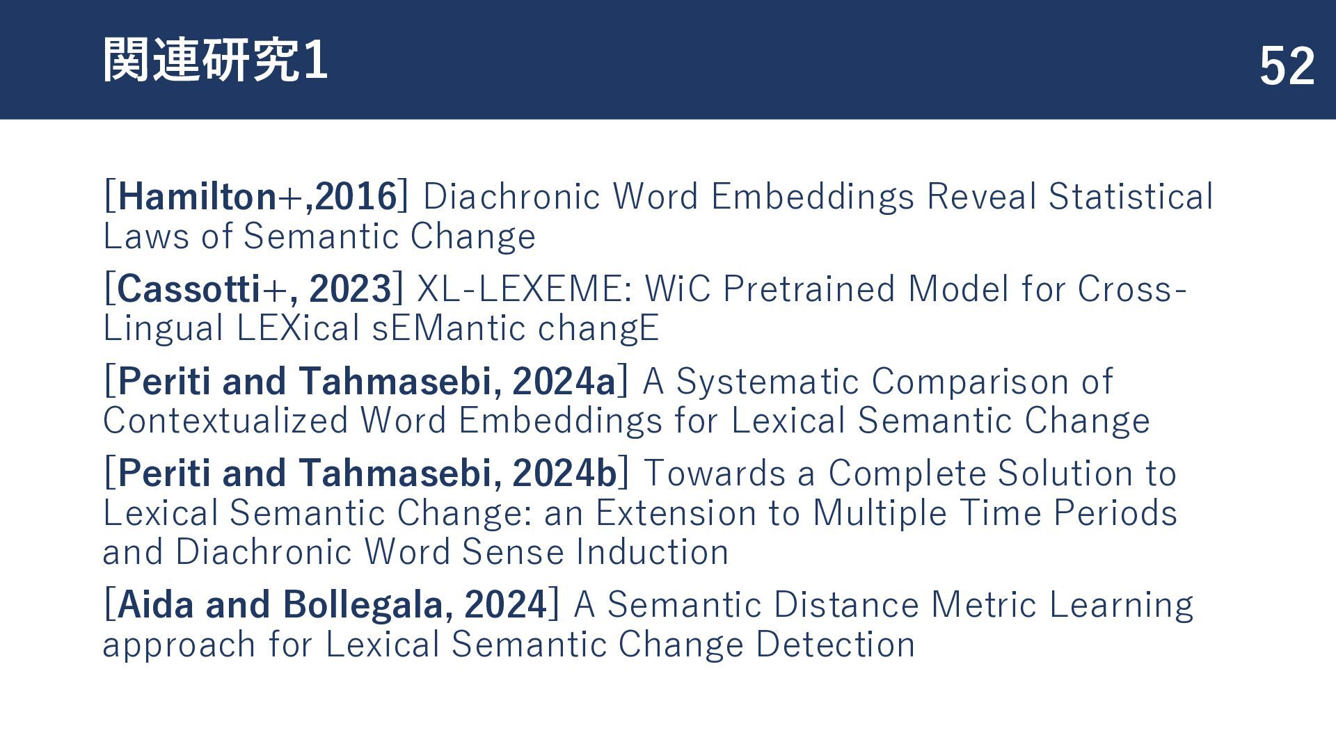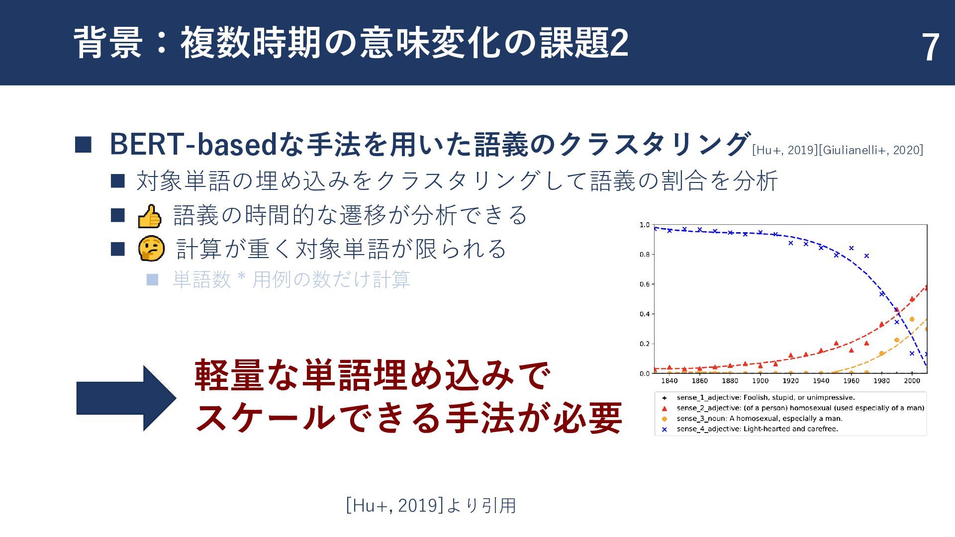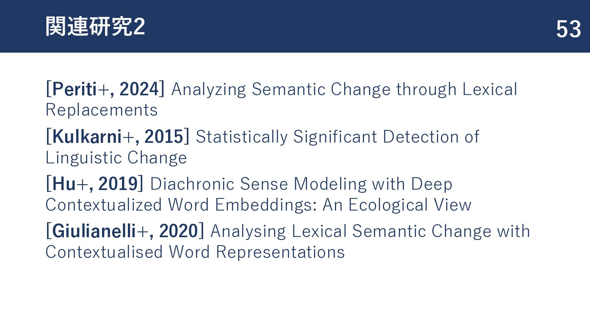 Tahmasebi, 2024a][Aida and Bollegala, 2024][Periti+, 2024] ◼ どの単語が意味変化したかを検出 ◼ 2つの時期間で意味変化の度合いを計測 ◼ 意味変化度合いがアノテーションされたデータセットが存在 ◼ 複数時期の意味変化 [Kulkarni+, 2015] [Hu+, 2019] [Giulianelli+, 2020] ◼ ある単語がどのように意味変化するかを分析 ◼ 変化点検出や語義の割合を計測 ◼ アノテーションされたデータセットは存在しない ◼ 既存手法には課題が存在 5 本研究はこちら!!!