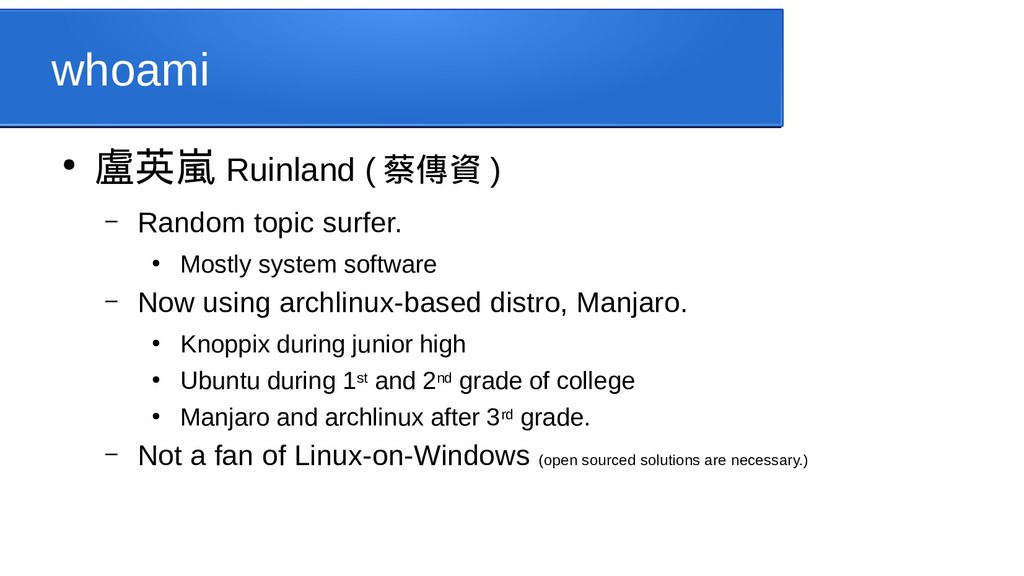 surfer. • Mostly system software – Now using archlinux-based distro, Manjaro. • Knoppix during junior high • Ubuntu during 1st and 2nd grade of college • Manjaro and archlinux after 3rd grade. – Not a fan of Linux-on-Windows (open sourced solutions are necessary.)