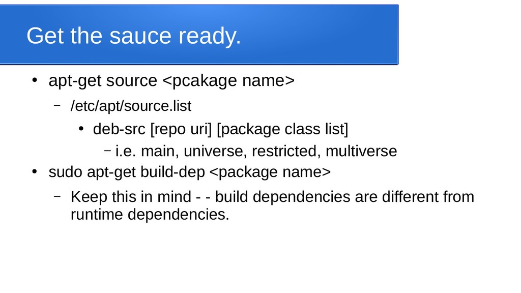 /etc/apt/source.list • deb-src [repo uri] [package class list] – i.e. main, universe, restricted, multiverse • sudo apt-get build-dep <package name> – Keep this in mind - - build dependencies are different from runtime dependencies.