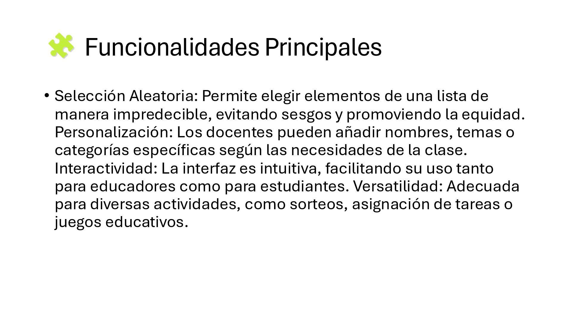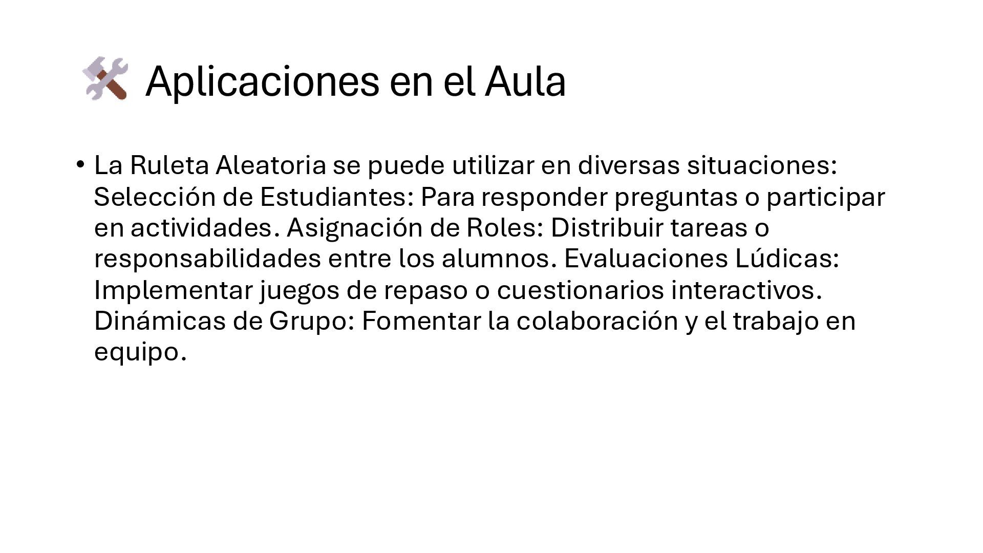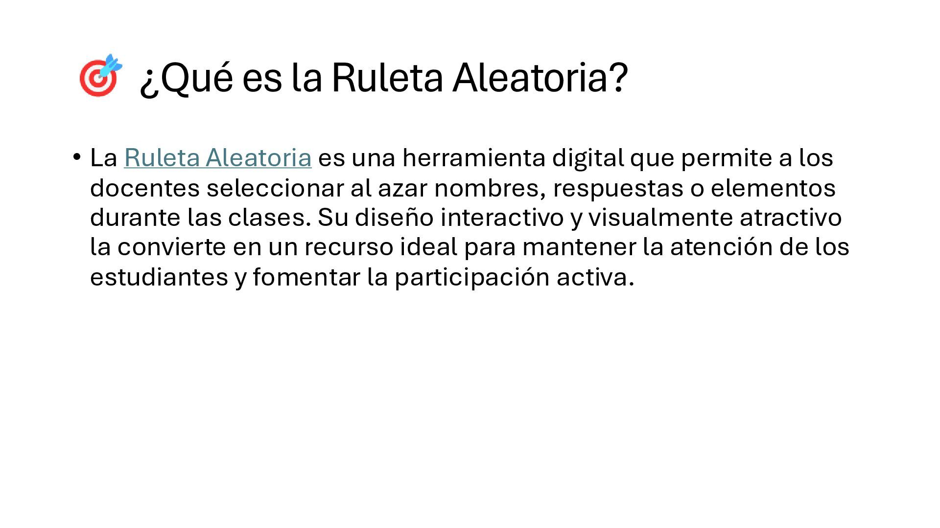 Ruleta Aleatoria es una herramienta online divertida y fácil de usar para sorteos, decisiones rápidas, juegos de aula, concursos, y entretenimiento general. Ofrece una ruleta personalizable donde puedes agregar nombres, números, colores, letras y más. Ideal para profesores, organizadores de eventos, grupos de amigos, o cualquier persona que quiera tomar decisiones de manera justa y al azar.