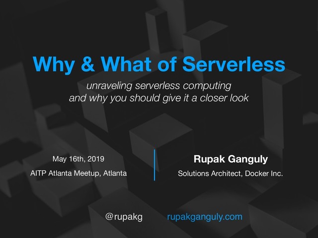 Unraveling serverless computing and why you should give it a closer look. In this session at AITP Atlanta Meetup, I talk about the serverless movement, the trend, the hype, and what it really means. I talk about the evolution of architecture, the tenets of serverless computing, its use cases & challenges, security implications. I also touched upon the total cost of ownership and adoption of serverless computing in the industry.