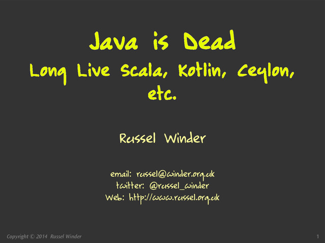 • Can Java: • Be less verbose. • Have better type inferencing. • Do concurrency and parallelism better. (Doug Lea, Brian Goetz and others have actually been doing this for a while.) • Have a reasonable module system, cf. Jigsaw vs. OSGi. • Be a real object-oriented language.