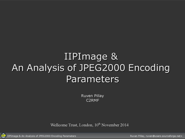 IIPImage presentation from the workshop "Current Trends and Future Directions for Digital Imaging in Libraries and Archives" at the Wellcome Trust on the 10th November 2014.