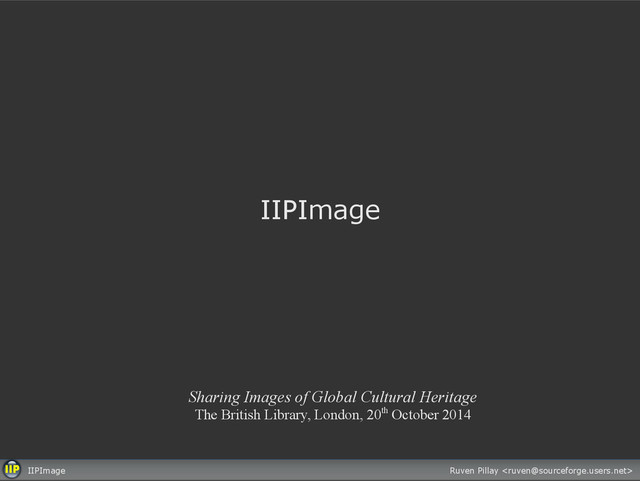 access protocols • IIP (Internet Imaging Protocol) • Zoomify • Deepzoom • IIIF 2.0 IIIF Availability Development branch of iipsrv: https://github.com/ruven/iipsrv Will be part of forthcoming iipsrv version 1.0 release