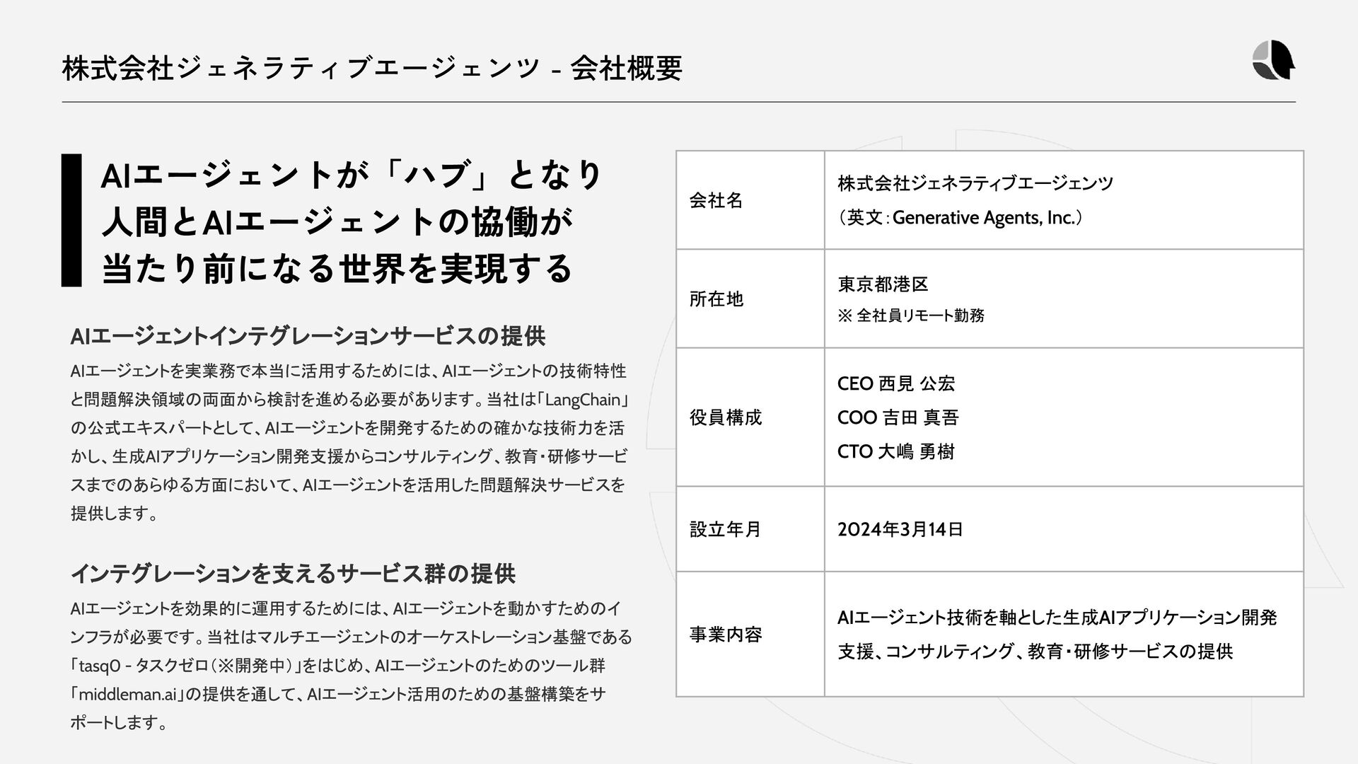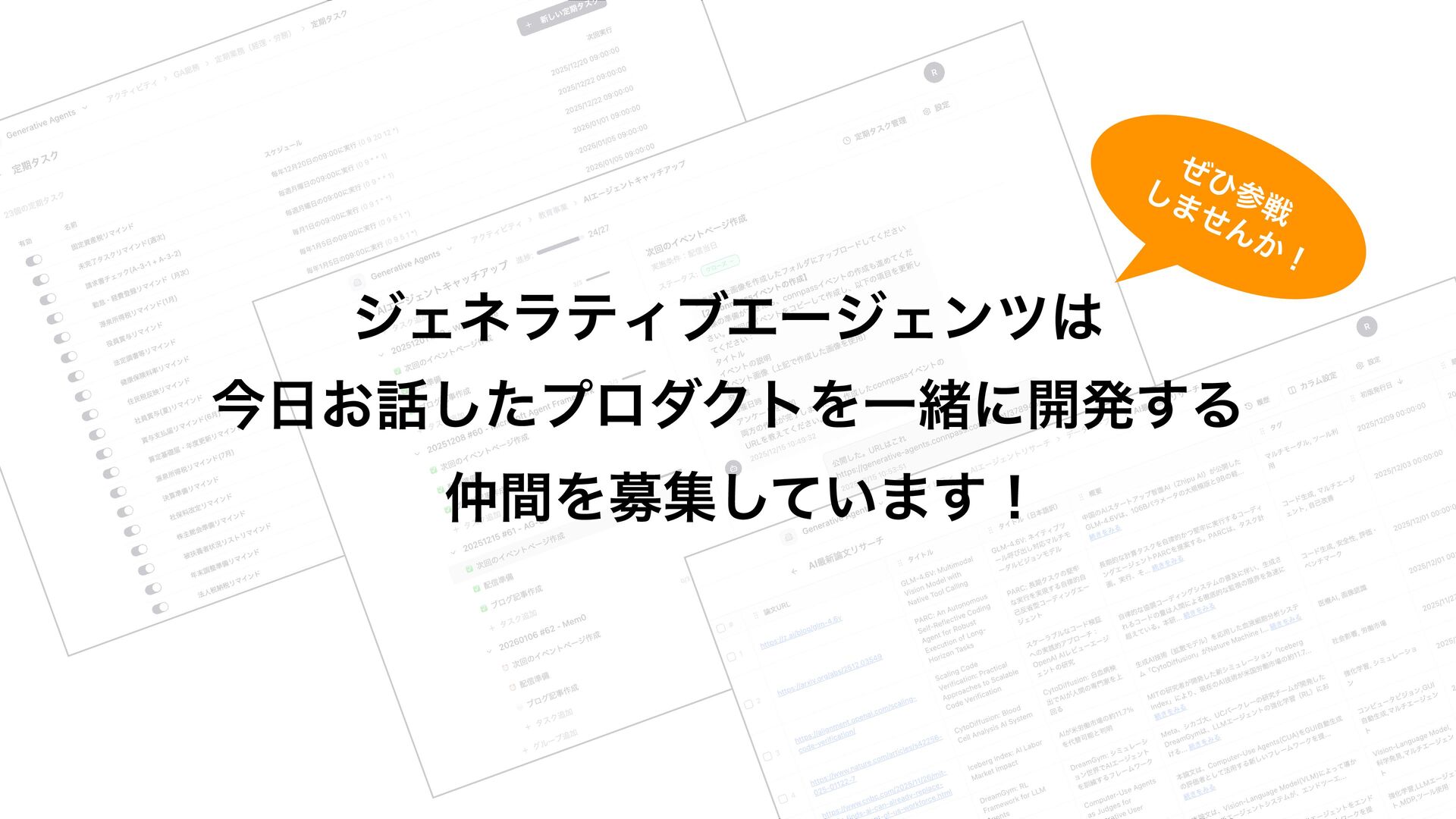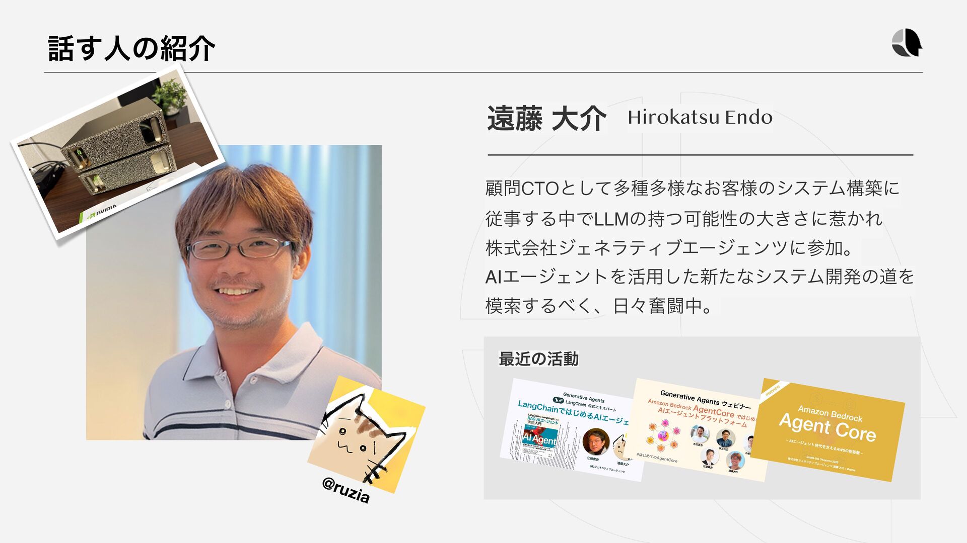 ͢ਓͷհ @ruzia ԕ౻ େհ Hirokatsu Endo ސCTOͱͯ͠ଟछଟ༷ͳ͓٬༷ͷγεςϜߏஙʹ ैࣄ͢ΔதͰLLMͷ࣋ͭՄೳੑͷେ͖͞ʹऒ͔Ε גࣜձࣾδΣωϥςΟϒΤʔδΣϯπʹࢀՃɻ AIΤʔδΣϯτΛ׆༻ͨ͠৽ͨͳγεςϜ։ൃͷಓΛ