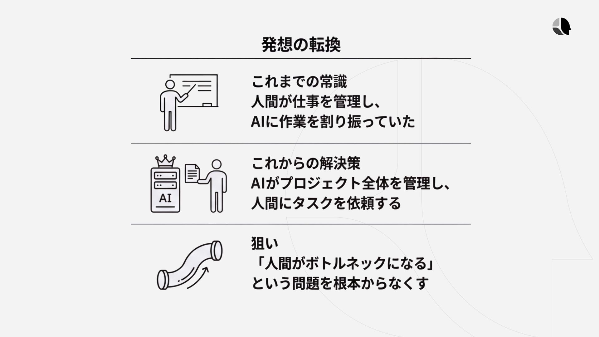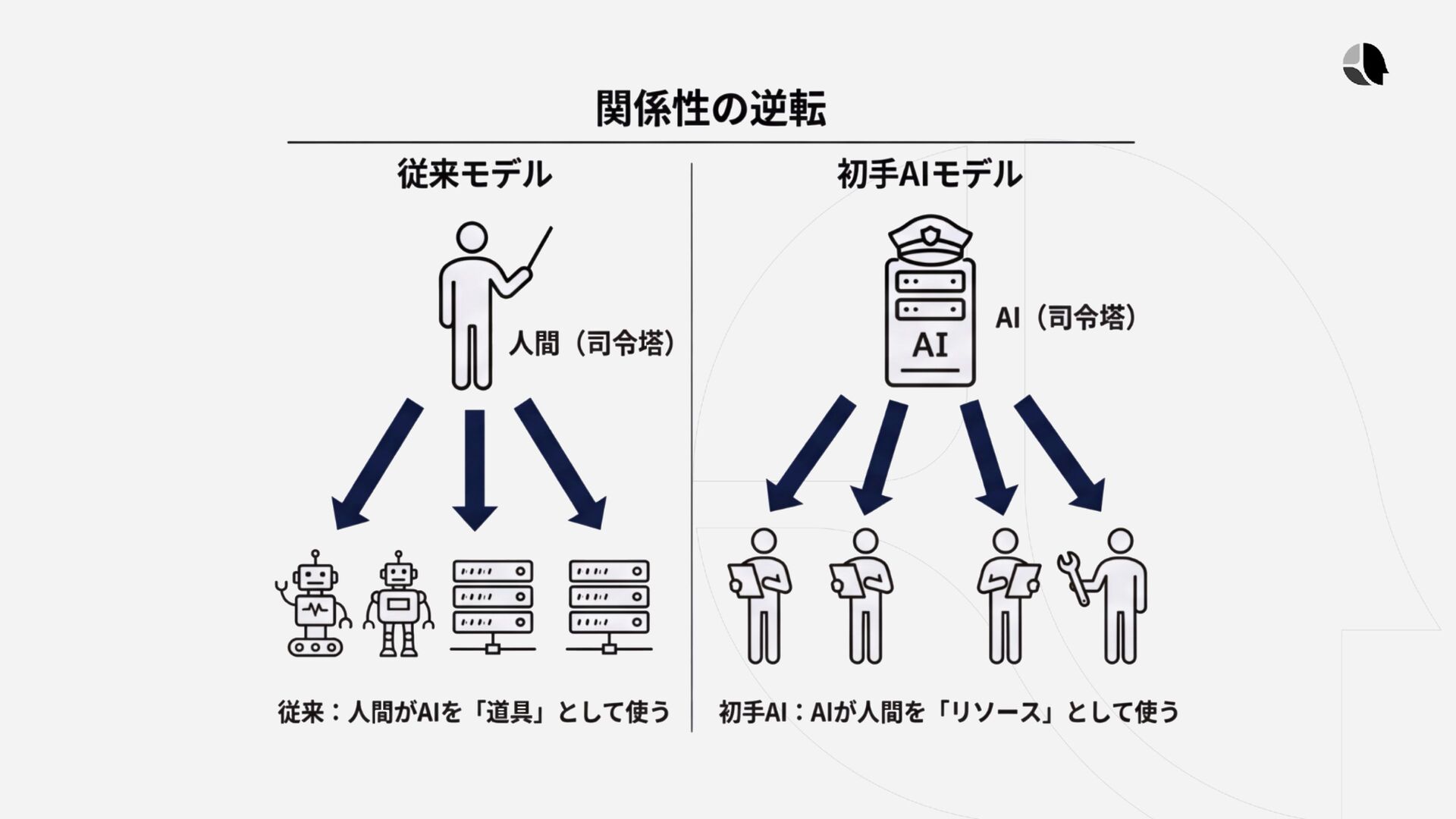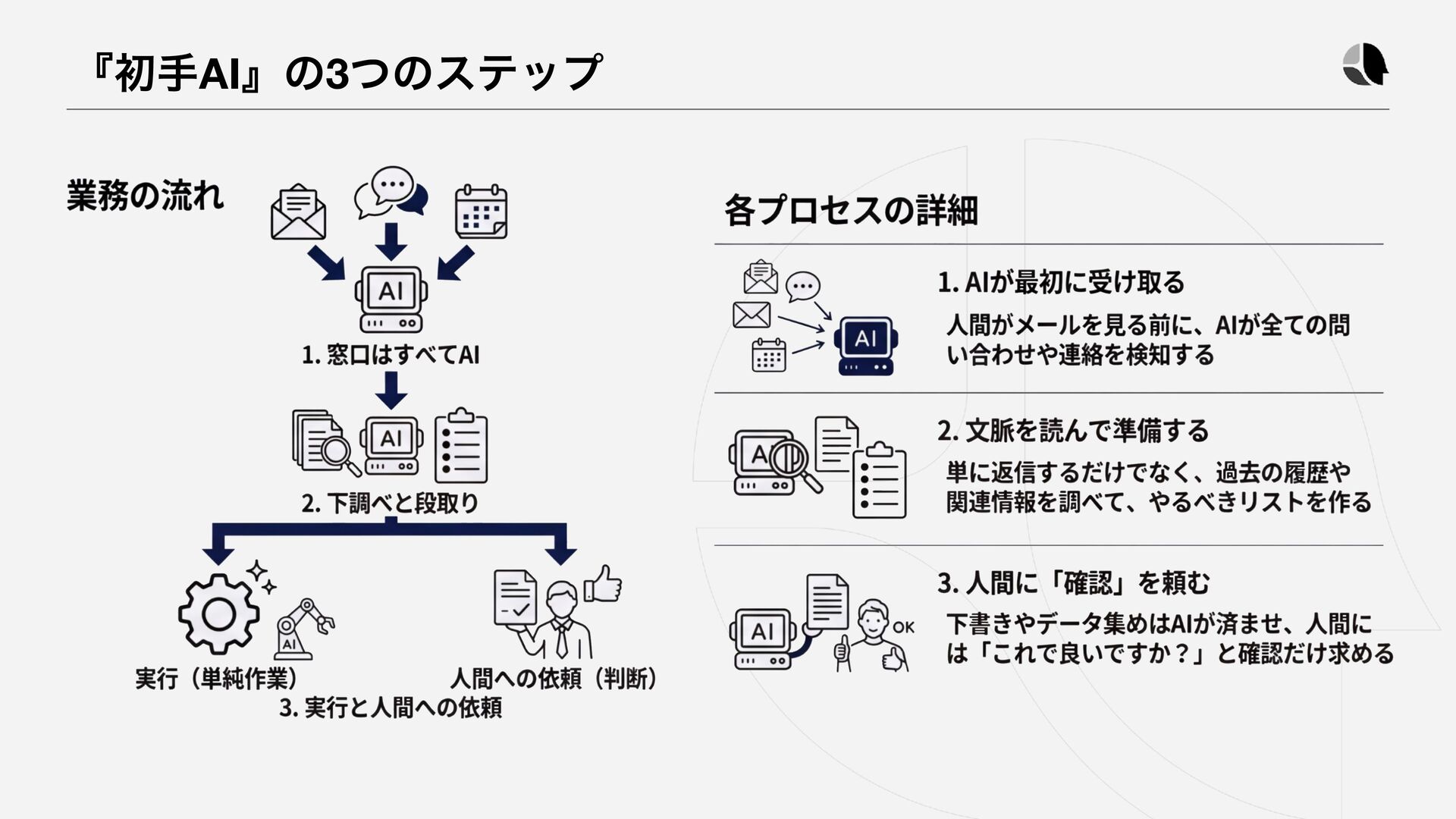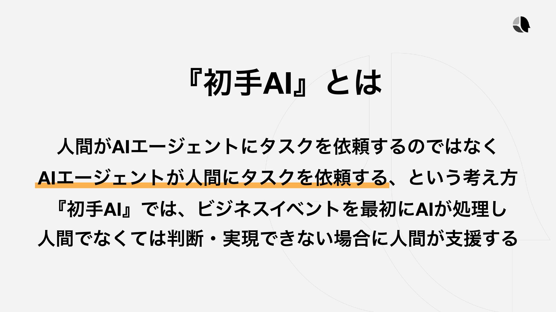 ʰॳखAIʱͱ ਓ͕ؒAIΤʔδΣϯτʹλεΫΛґཔ͢ΔͷͰͳ͘ AIΤʔδΣϯτ͕ਓؒʹλεΫΛґཔ͢Δɺͱ͍͏ߟ͑ํ ʰॳखAIʱͰɺϏδωεΠϕϯτΛ࠷ॳʹAI͕ॲཧ͠ ਓؒͰͳͯ͘அɾ࣮ݱͰ͖ͳ͍߹ʹਓ͕ؒࢧԉ͢Δ