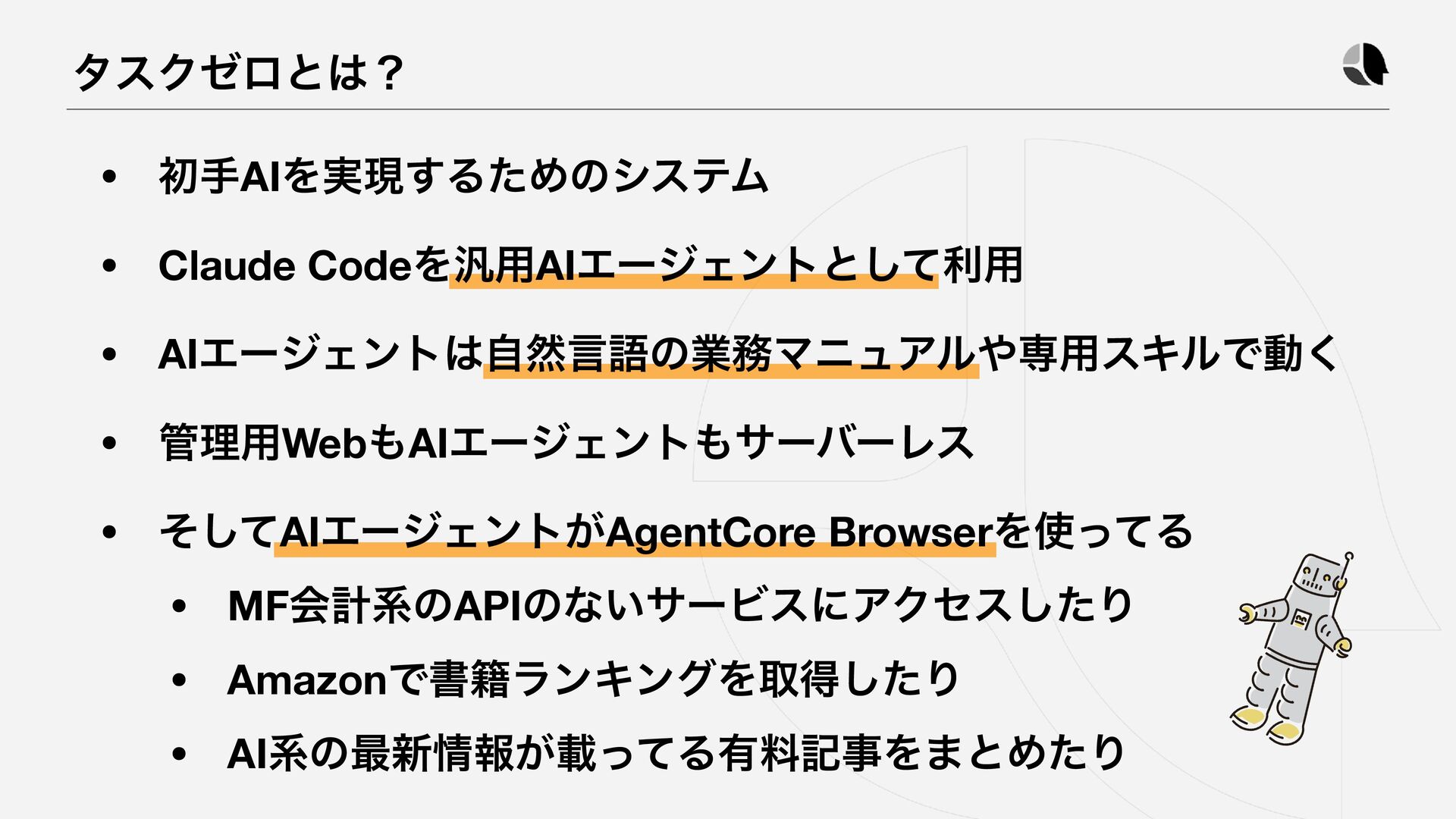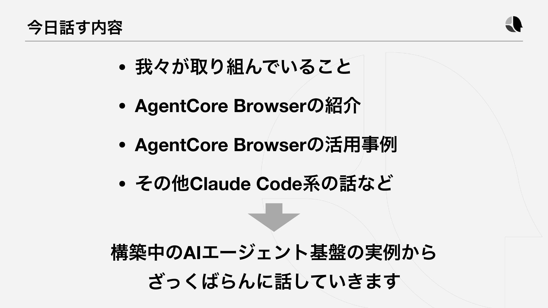 2025/12/20 AI Builders Day AgentCore BrowserͱClaude CodeεΩϧΛ׆༻ͨ͠ ʰॳखAIʱΛ࣮ݱ͢ΔۀࣗಈԽAIΤʔδΣϯτج൫ גࣜձࣾδΣωϥςΟϒΤʔδΣϯπ ԕ౻େհ