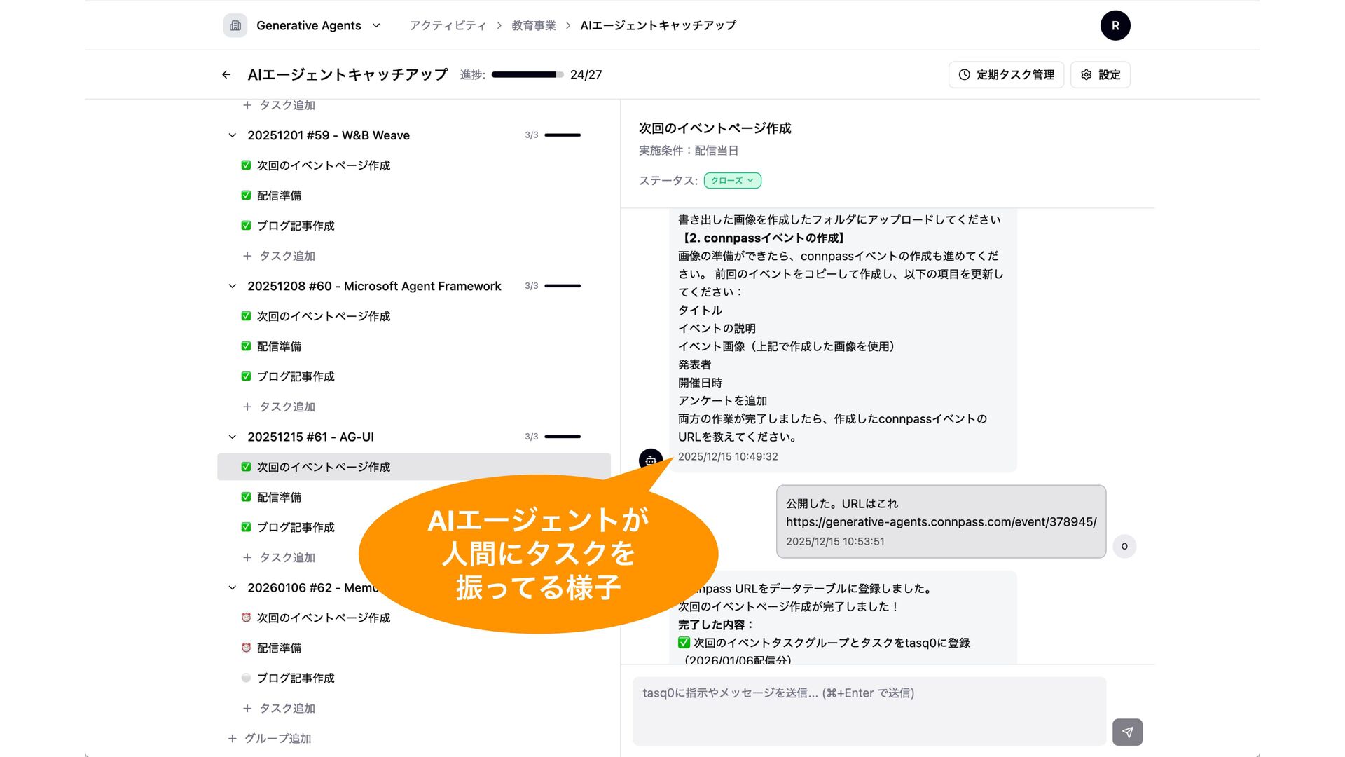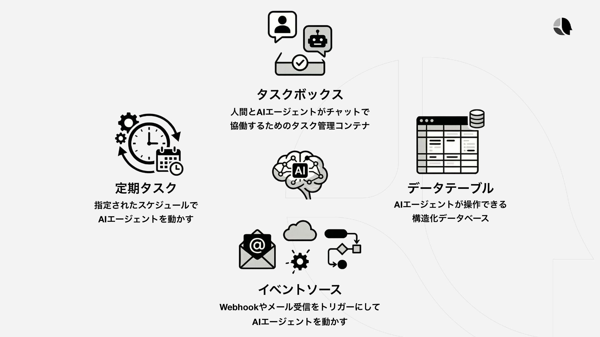 λεΫϘοΫε ఆظλεΫ σʔλςʔϒϧ Πϕϯτιʔε ਓؒͱAIΤʔδΣϯτ͕νϟοτͰ ڠಇ͢ΔͨΊͷλεΫཧίϯςφ ࢦఆ͞ΕͨεέδϡʔϧͰ AIΤʔδΣϯτΛಈ͔͢ AIΤʔδΣϯτ͕ૢ࡞Ͱ͖Δ ߏԽσʔλϕʔε