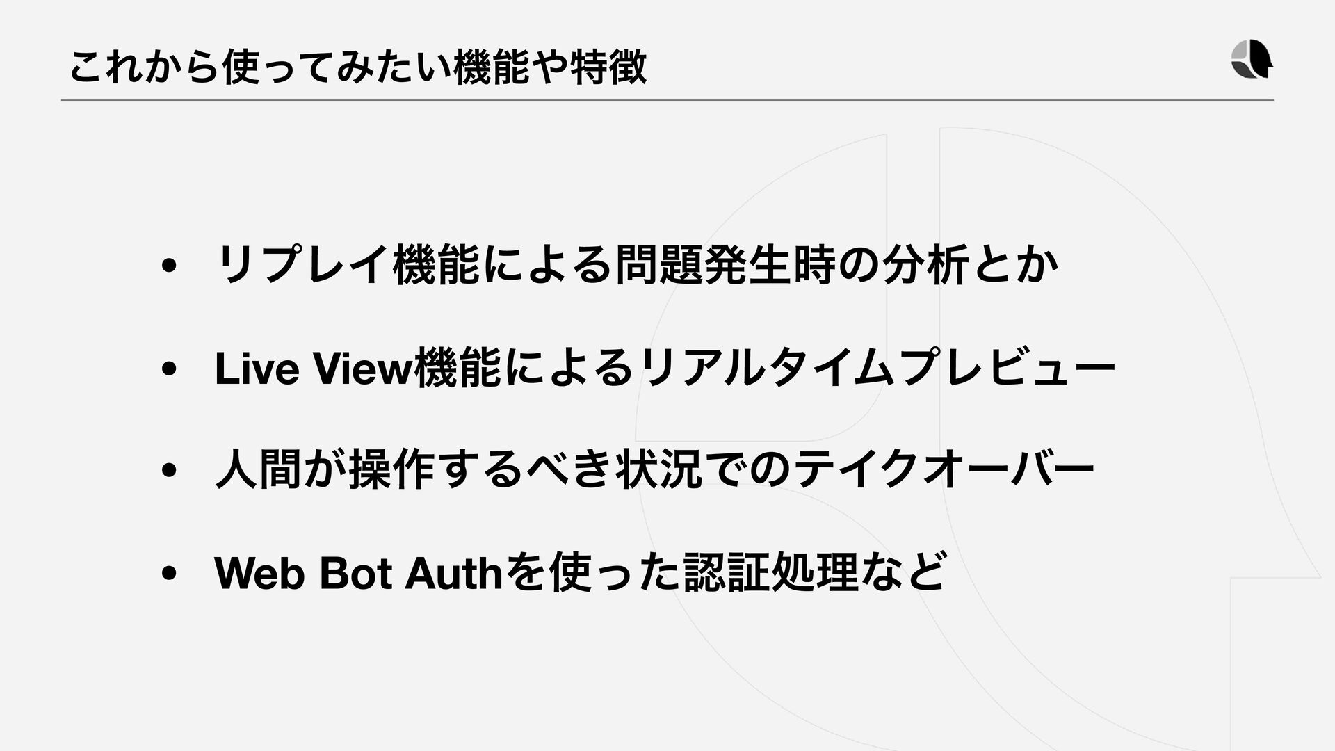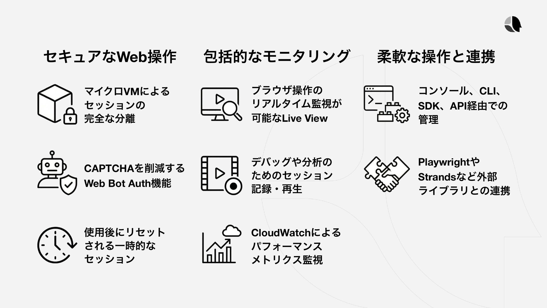 ༻ޙʹϦηοτ ͞ΕΔҰ࣌తͳ ηογϣϯ ϒϥβૢ࡞ͷ ϦΞϧλΠϜࢹ͕ ՄೳͳLive View σόοάੳͷ ͨΊͷηογϣϯ هɾ࠶ੜ CloudWatchʹΑΔ ύϑΥʔϚϯε ϝτϦΫεࢹ ίϯιʔϧɺCLIɺ SDKɺAPIܦ༝Ͱͷ ཧ Playwright StrandsͳͲ֎෦ ϥΠϒϥϦͱͷ࿈ܞ
