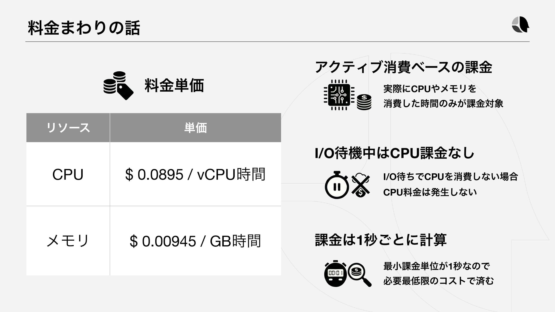 0.00945 / GB࣌ؒ ྉۚ୯Ձ ΞΫςΟϒফඅϕʔεͷ՝ۚ ࣮ࡍʹCPUϝϞϦΛ ফඅͨ࣌ؒ͠ͷΈ͕՝ۚର I/OػதCPU՝ۚͳ͠ I/OͪͰCPUΛফඅ͠ͳ͍߹ CPUྉۚൃੜ͠ͳ͍ ՝ۚ1ඵ͝ͱʹܭࢉ ࠷খ՝ۚ୯Ґ͕1ඵͳͷͰ ඞཁ࠷ݶͷίετͰࡁΉ