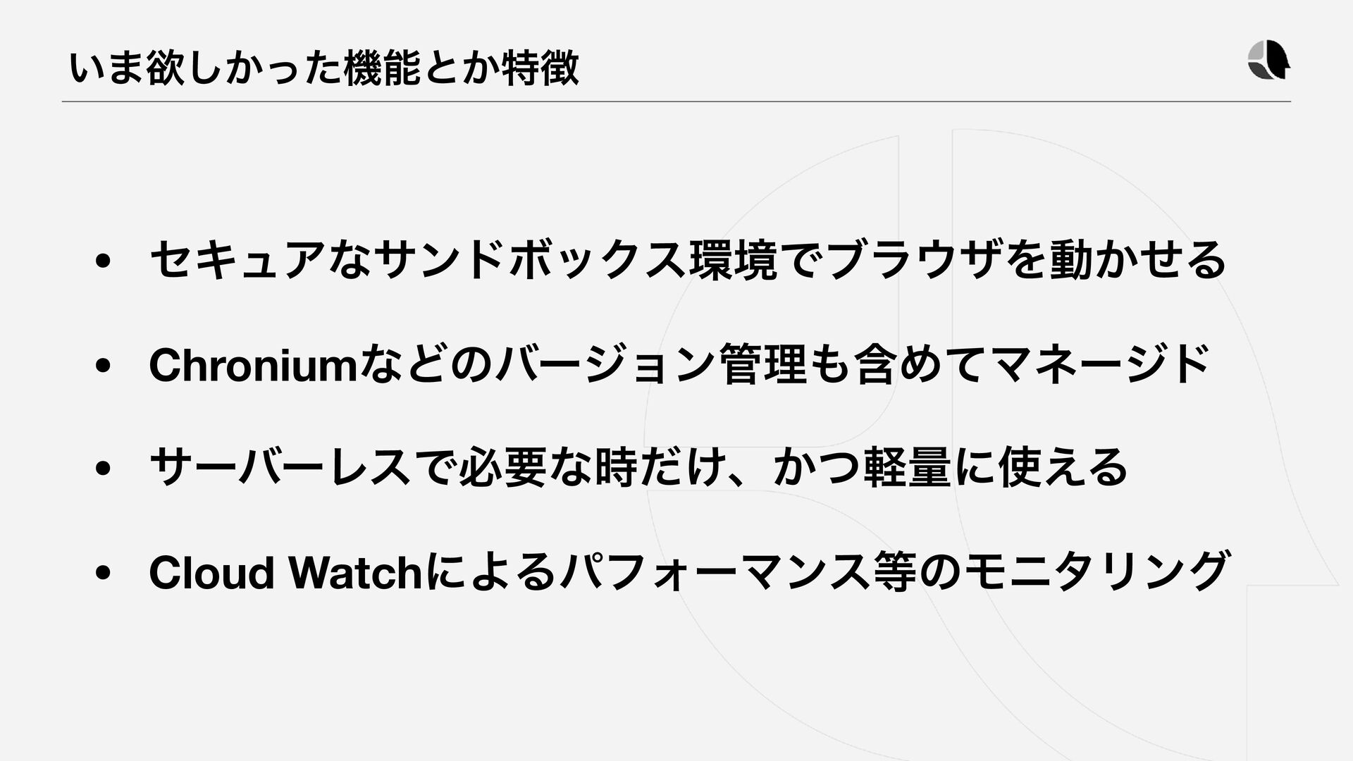͍·ཉ͔ͬͨ͠ػೳͱ͔ಛ • ηΩϡΞͳαϯυϘοΫεڥͰϒϥβΛಈ͔ͤΔ • ChroniumͳͲͷόʔδϣϯཧؚΊͯϚωʔδυ • αʔόʔϨεͰඞཁͳ͚࣌ͩɺ͔ͭܰྔʹ͑Δ • Cloud WatchʹΑΔύϑΥʔϚϯεͷϞχλϦϯά