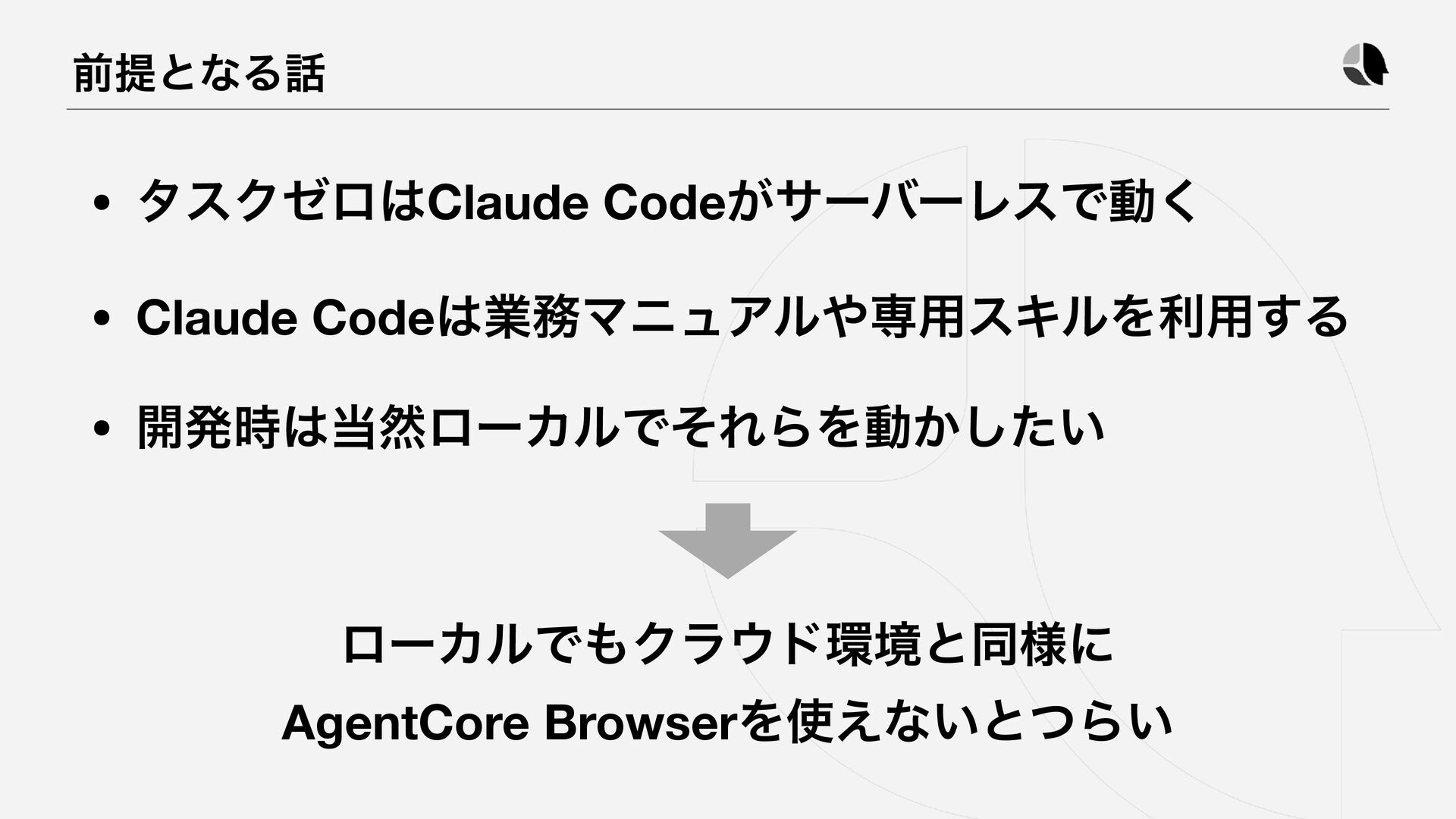 લఏͱͳΔ • λεΫθϩClaude Code͕αʔόʔϨεͰಈ͘ • Claude CodeۀϚχϡΞϧઐ༻εΩϧΛར༻͢Δ • ։ൃ࣌વϩʔΧϧͰͦΕΒΛಈ͔͍ͨ͠ ϩʔΧϧͰΫϥυڥͱಉ༷ʹ
