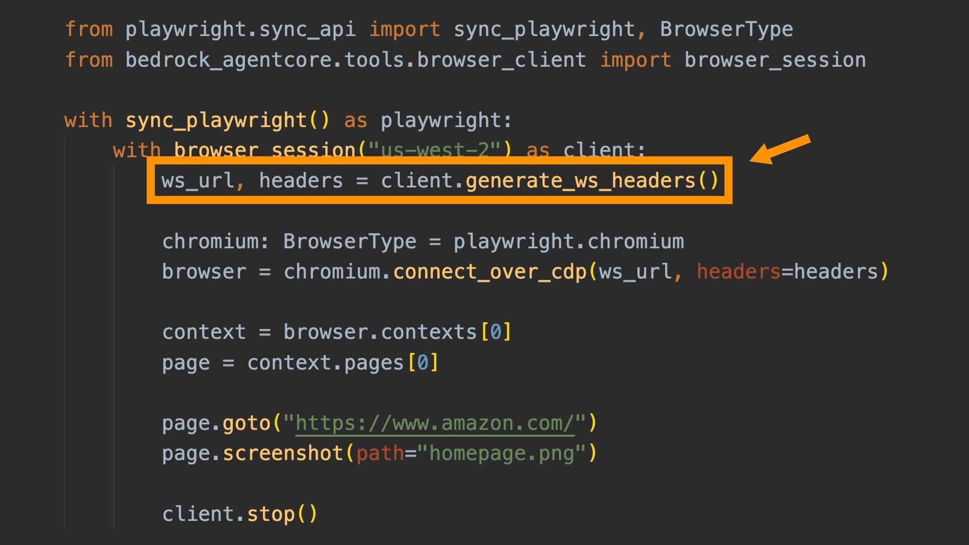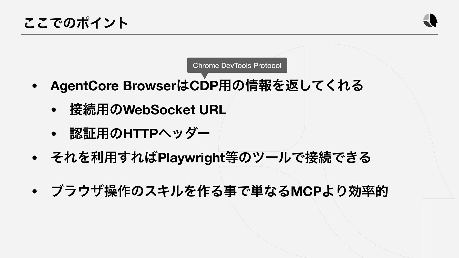 ͜͜ͰͷϙΠϯτ • AgentCore BrowserCDP༻ͷใΛฦͯ͘͠ΕΔ • ଓ༻ͷWebSocket URL • ೝূ༻ͷHTTPϔομʔ •