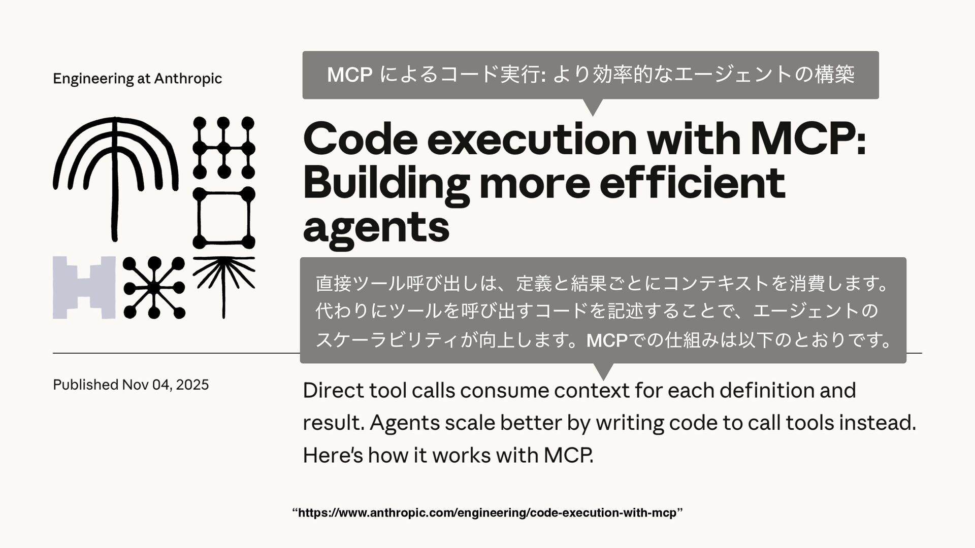 “https://www.anthropic.com/engineering/code-execution-with-mcp” MCP ʹΑΔίʔυ࣮ߦ: ΑΓޮతͳΤʔδΣϯτͷߏங πʔϧݺͼग़͠ɺఆٛͱ݁Ռ͝ͱʹίϯςΩετΛফඅ͠·͢ɻ ΘΓʹπʔϧΛݺͼग़͢ίʔυΛهड़͢Δ͜ͱͰɺΤʔδΣϯτͷ εέʔϥϏϦςΟ্͕͠·͢ɻMCPͰͷΈҎԼͷͱ͓ΓͰ͢ɻ