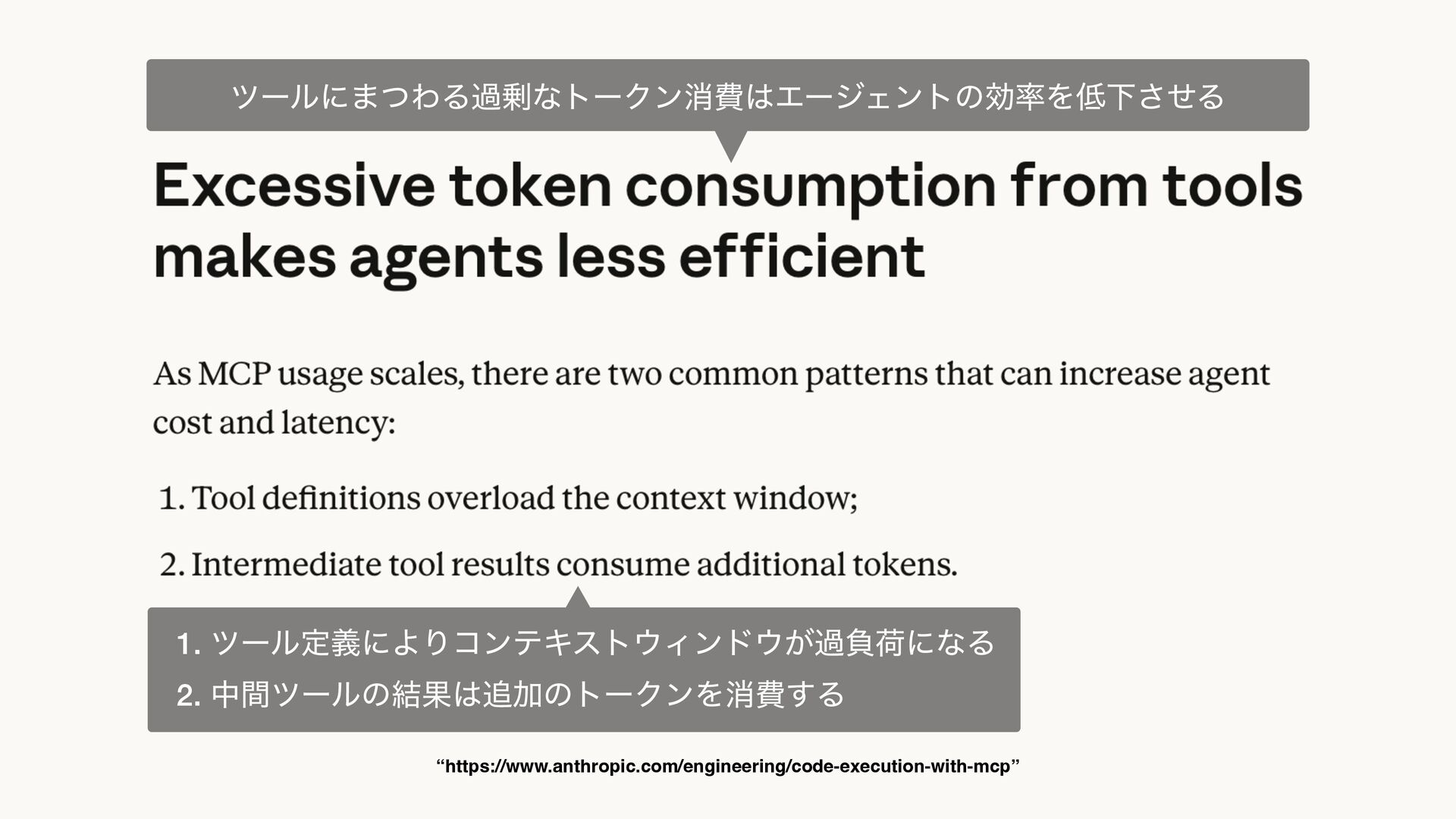 “https://www.anthropic.com/engineering/code-execution-with-mcp” πʔϧʹ·ͭΘΔաͳτʔΫϯফඅΤʔδΣϯτͷޮΛԼͤ͞Δ 1. πʔϧఆٛʹΑΓίϯςΩετΟϯυ͕աෛՙʹͳΔ 2. தؒπʔϧͷ݁ՌՃͷτʔΫϯΛফඅ͢Δ