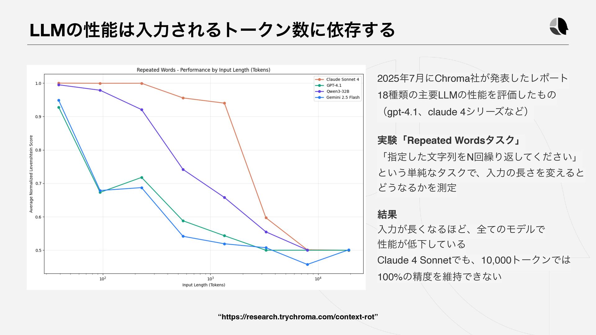 LLMͷੑೳೖྗ͞ΕΔτʔΫϯʹґଘ͢Δ “https://research.trychroma.com/context-rot” 20257݄ʹChroma͕ࣾൃදͨ͠Ϩϙʔτ 18छྨͷओཁLLMͷੑೳΛධՁͨ͠ͷ ʢgpt-4.1ɺclaude 4γϦʔζͳͲʣ ࣮ݧʮRepeated WordsλεΫʯ ʮࢦఆͨ͠จࣈྻΛNճ܁Γฦ͍ͯͩ͘͠͞ʯ