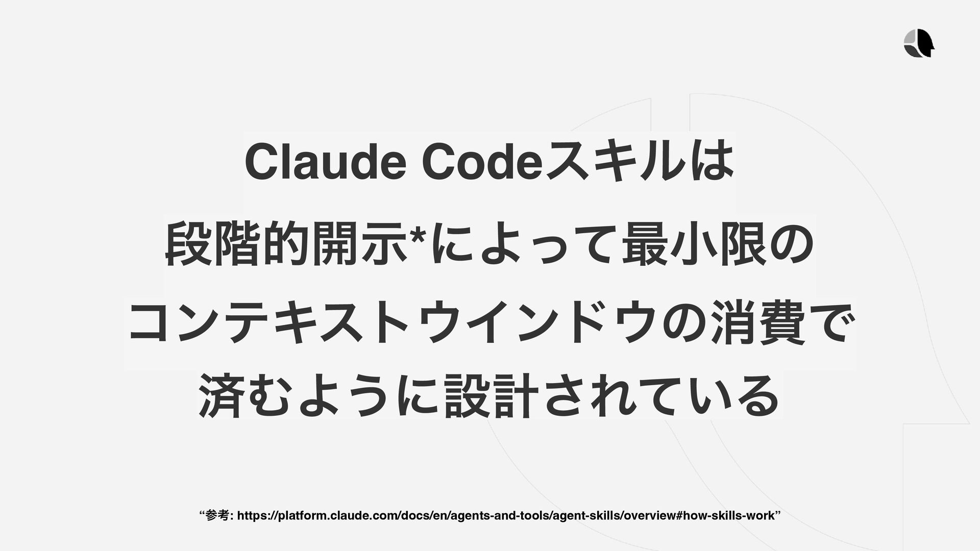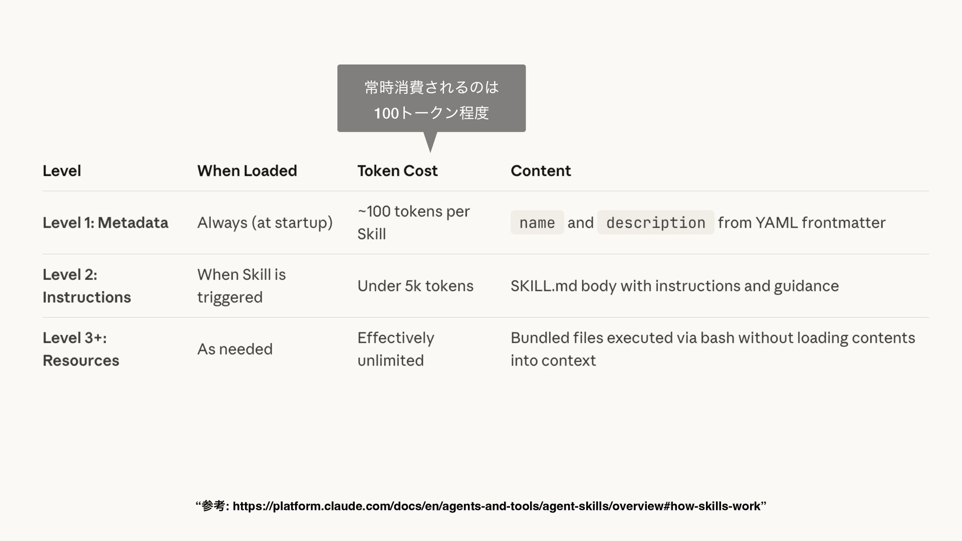 Claude CodeεΩϧ ஈ֊త։ࣔ*ʹΑͬͯ࠷খݶͷ ίϯςΩετΠϯυͷফඅͰ ࡁΉΑ͏ʹઃܭ͞Ε͍ͯΔ “ࢀߟ: https://platform.claude.com/docs/en/agents-and-tools/agent-skills/overview#how-skills-work”