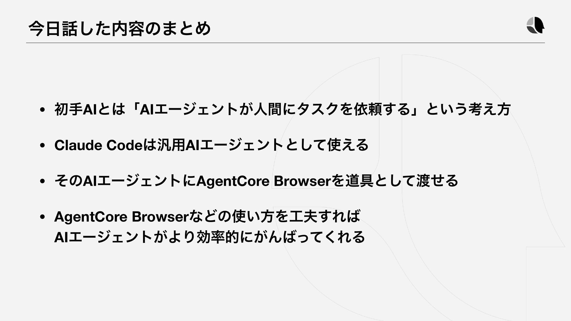 ࠓͨ͠༰ͷ·ͱΊ • ॳखAIͱʮAIΤʔδΣϯτ͕ਓؒʹλεΫΛґཔ͢Δʯͱ͍͏ߟ͑ํ • Claude Code൚༻AIΤʔδΣϯτͱͯ͑͠Δ • ͦͷAIΤʔδΣϯτʹAgentCore BrowserΛಓ۩ͱͯͤ͠Δ •