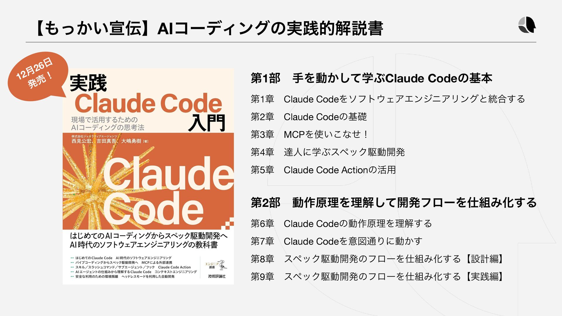 ʲ͔͍ͬએʳAIίʔσΟϯάͷ࣮ફతղઆॻ 12݄26 ൃചʂ ୈ1෦ɹखΛಈֶ͔ͯ͠ͿClaude Codeͷجຊ ୈ1ষɹClaude CodeΛιϑτΣΞΤϯδχΞϦϯάͱ౷߹͢Δ ୈ2ষɹClaude Codeͷجૅ ୈ3ষɹMCPΛ͍͜ͳͤʂ