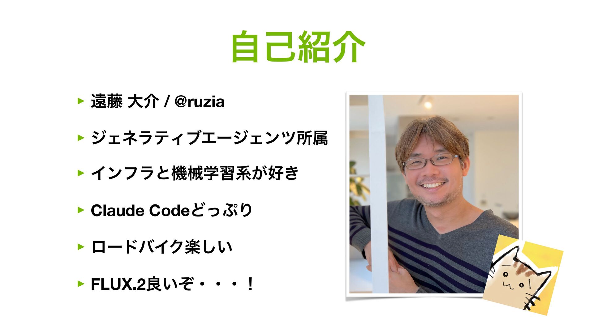 ࣗݾհ ‣ԕ౻ େհ / @ruzia ‣δΣωϥςΟϒΤʔδΣϯπॴଐ ‣Πϯϑϥͱػցֶशܥ͕͖ ‣Claude CodeͲͬΓ ‣ϩʔυόΠΫָ͍͠