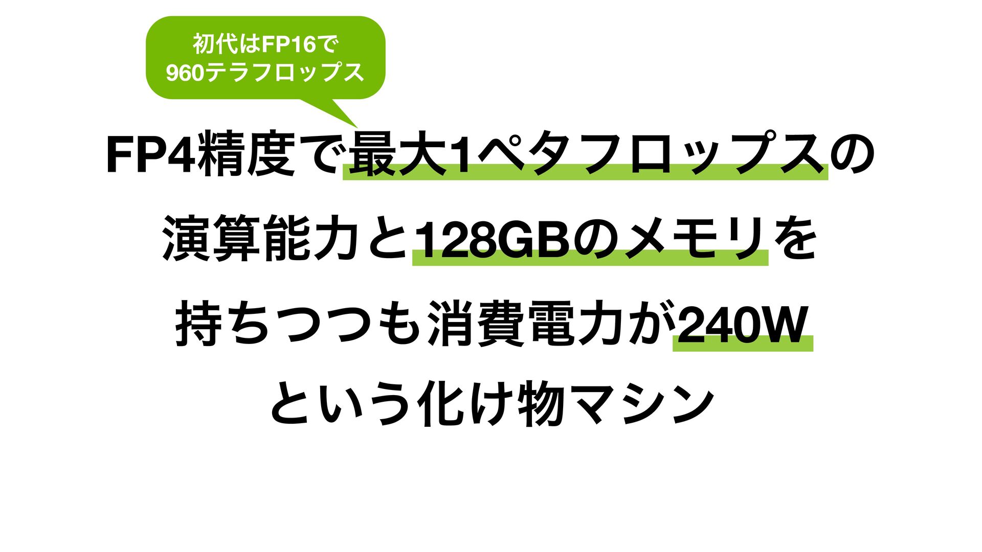 ॳFP16Ͱ 960ςϥϑϩοϓε FP4ਫ਼Ͱ࠷େ1ϖλϑϩοϓεͷ ԋࢉೳྗͱ128GBͷϝϞϦΛ ࣋ͪͭͭফඅిྗ͕240W ͱ͍͏Խ͚Ϛγϯ