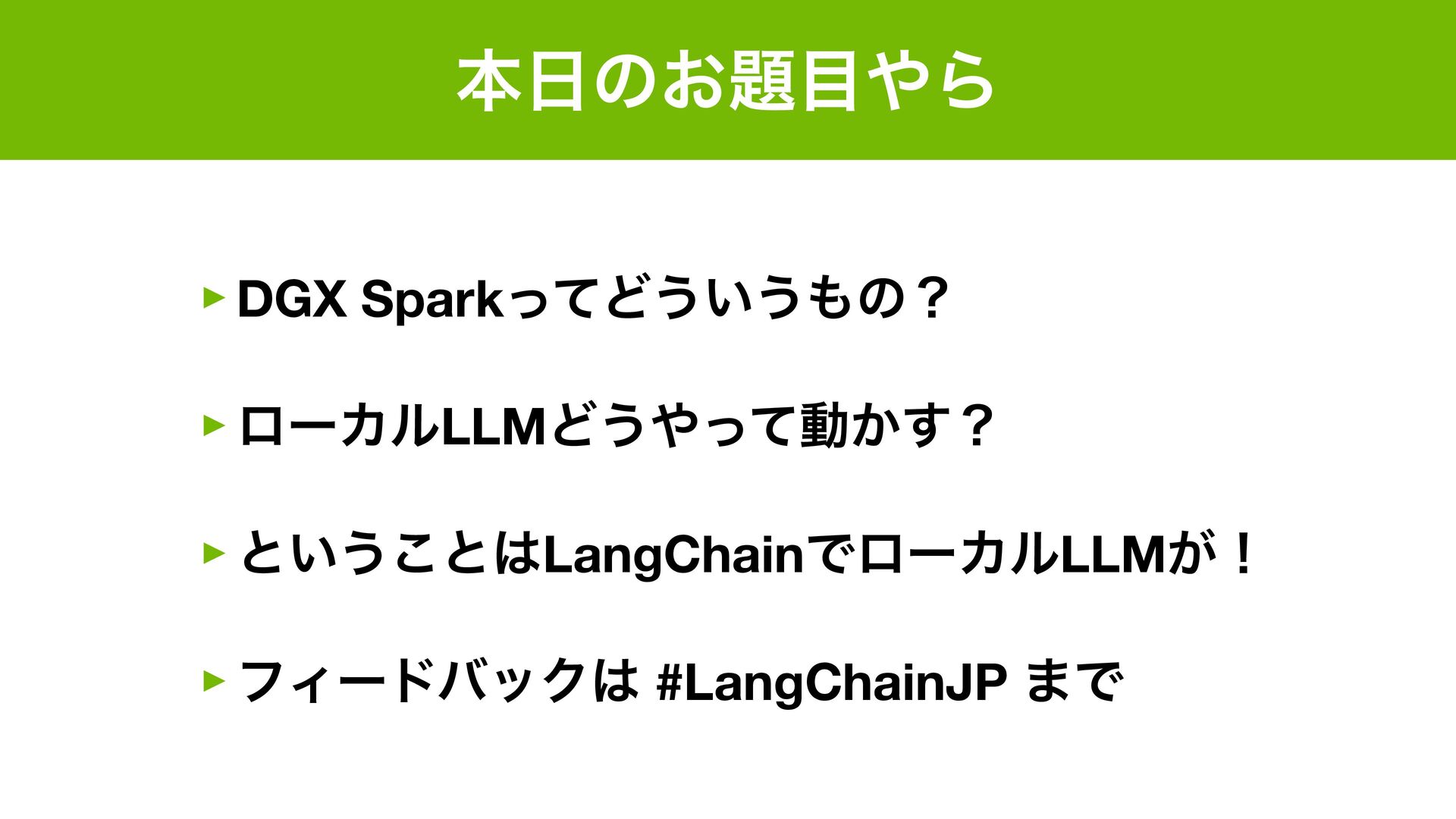 ຊͷ͓Β ‣DGX SparkͬͯͲ͏͍͏ͷʁ ‣ϩʔΧϧLLMͲ͏ͬͯಈ͔͢ʁ ‣ͱ͍͏͜ͱLangChainͰϩʔΧϧLLM͕ʂ ‣ϑΟʔυόοΫ #LangChainJP ·Ͱ