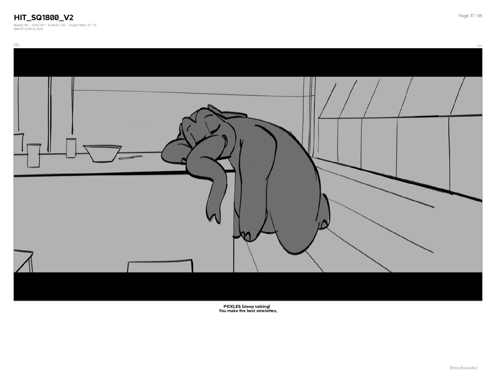 Aspect Ratio: 37 : 20 DRAFT: JUNE 11, 2020 Page: 17 / 68 17A 0:32 PICKLES (sleep talking) You make the best omelettes,