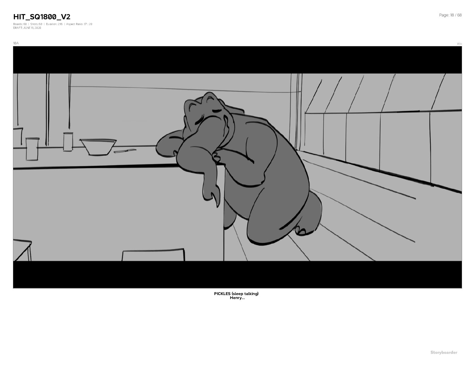 Aspect Ratio: 37 : 20 DRAFT: JUNE 11, 2020 Page: 18 / 68 18A 0:34 PICKLES (sleep talking) Henry...
