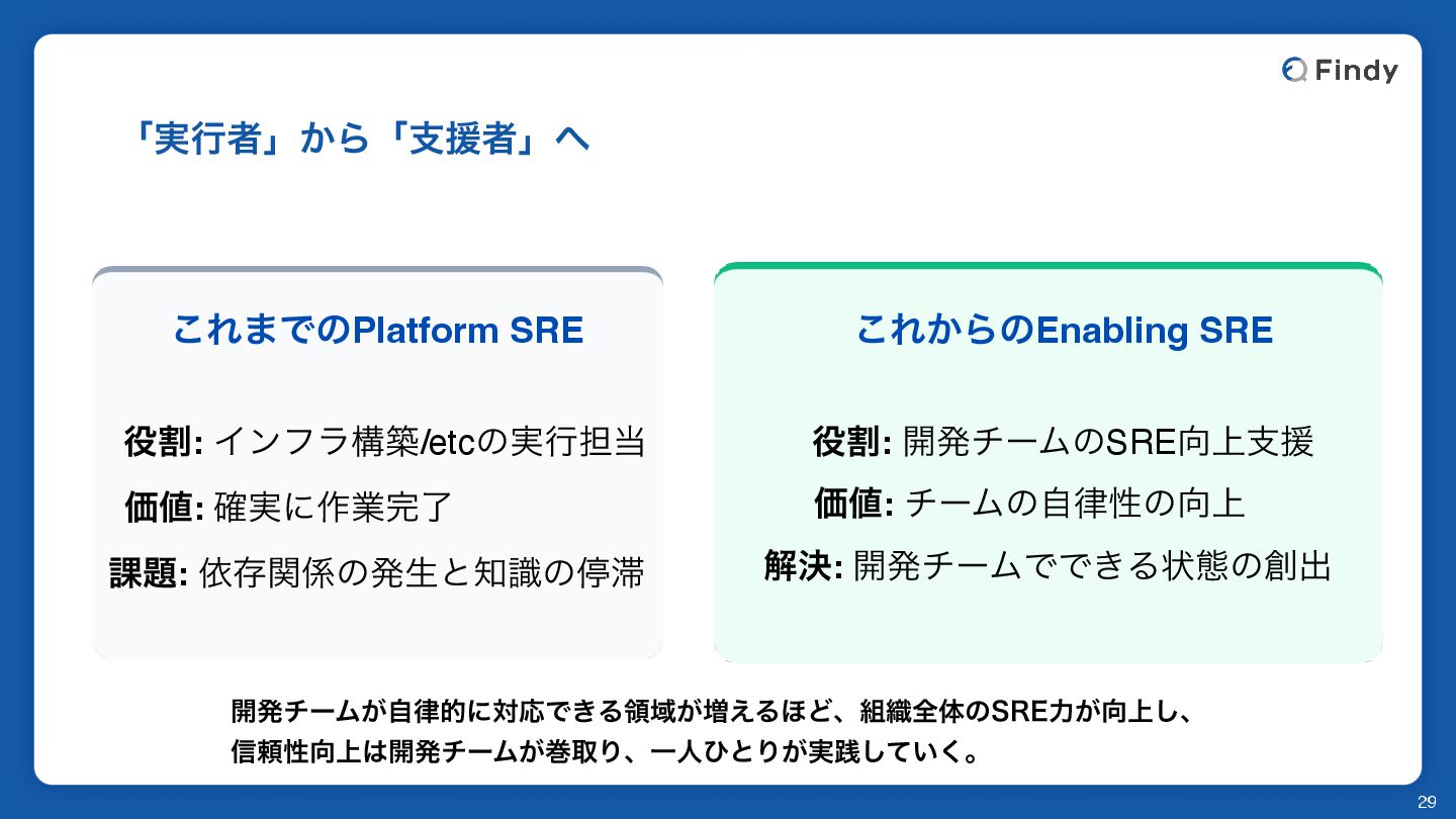 ͜Ε͔ΒͷEnabling SRE ׂ: ։ൃνʔϜͷSRE্ࢧԉ Ձ: νʔϜͷࣗੑͷ্ ղܾ: ։ൃνʔϜͰͰ͖Δঢ়ଶͷग़ ։ൃνʔϜ͕ࣗతʹରԠͰ͖ΔྖҬ͕૿͑Δ΄Ͳɺ৫શମͷ43&ྗ্͕͠ɺ ৴པੑ্։ൃνʔϜ͕רऔΓɺҰਓͻͱΓ͕࣮ફ͍ͯ͘͠ɻ