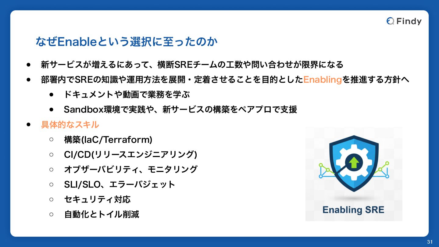 ͳͥ&OBCMFͱ͍͏બʹࢸͬͨͷ͔ 31 • ৽αʔϏε͕૿͑Δʹ͋ͬͯɺԣஅ43&νʔϜͷ͍߹Θ͕ͤݶքʹͳΔ • ෦ॺͰ43&ͷࣝӡ༻ํ๏Λల։ɾఆணͤ͞Δ͜ͱΛతͱͨ͠&OBCMJOHΛਪਐ͢Δํ • υΩϡϝϯτಈըͰۀΛֶͿ • 4BOECPYڥͰ࣮ફɺ৽αʔϏεͷߏஙΛϖΞϓϩͰࢧԉ