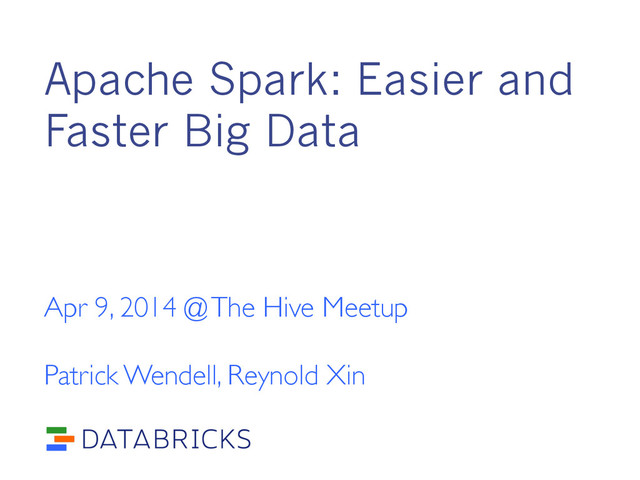 extends MapReduceBase implements Mapper<LongWritable, Text, Text, IntWritable> { private final static IntWritable one = new IntWritable(1); private Text word = new Text(); public void map(LongWritable key, Text value, OutputCollector<Text, IntWritable> output, Reporter reporter) throws IOException { String line = value.toString(); StringTokenizer itr = new StringTokenizer(line); while (itr.hasMoreTokens()) { word.set(itr.nextToken()); output.collect(word, one); } } } public static class WorkdCountReduce extends MapReduceBase implements Reducer<Text, IntWritable, Text, IntWritable> { public void reduce(Text key, Iterator<IntWritable> values, OutputCollector<Text, IntWritable> output, Reporter reporter) throws IOException { int sum = 0; while (values.hasNext()) { sum += values.next().get(); } output.collect(key, new IntWritable(sum)); } } Hadoop MapReduce val spark = new SparkContext(master, appName, [sparkHome], [jars]) val file = spark.textFile("hdfs://...") val counts = file.flatMap(line => line.split(" ")) .map(word => (word, 1)) .reduceByKey(_ + _) counts.saveAsTextFile("hdfs://...")