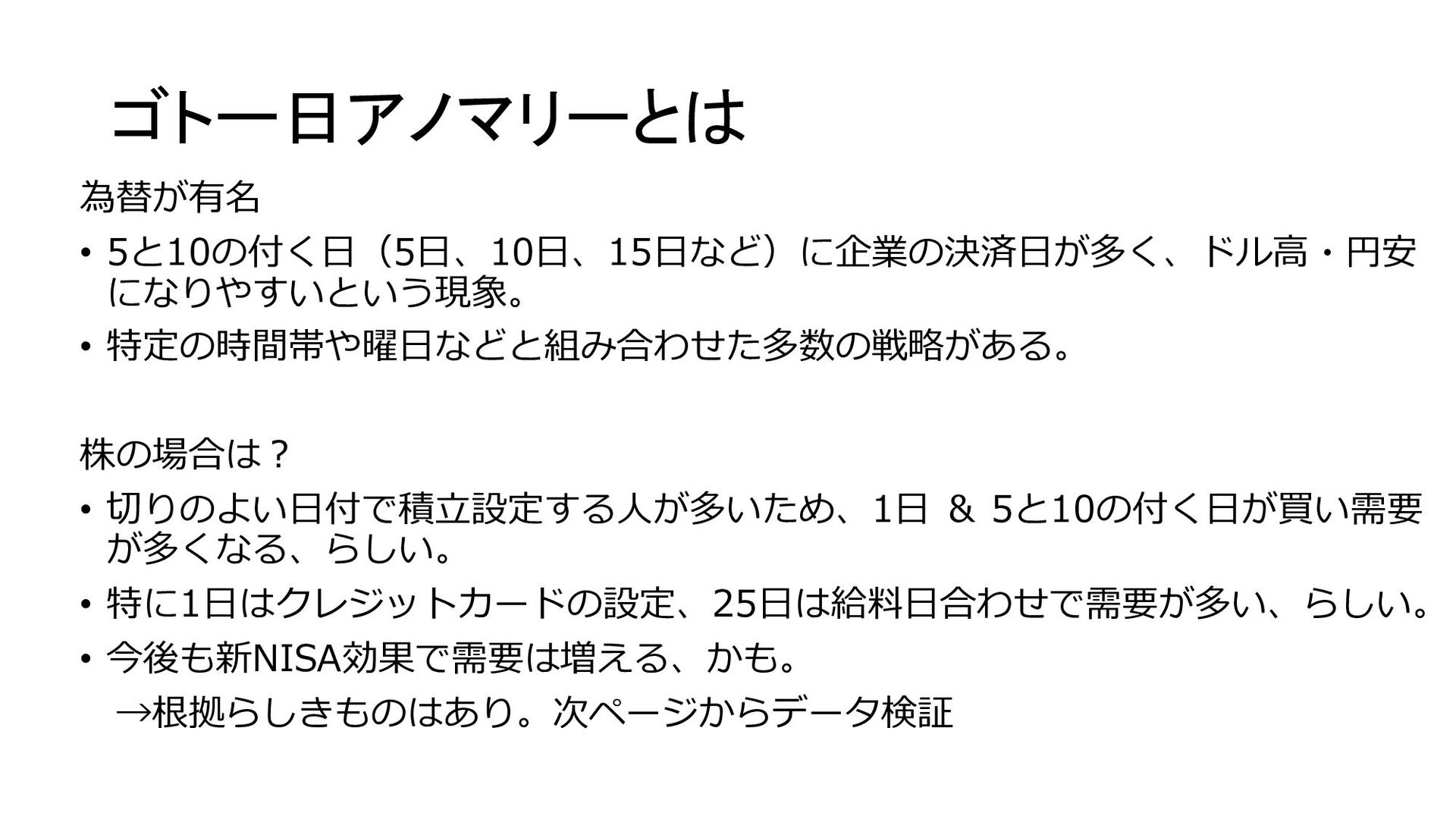 ゴトー日アノマリーとは 為替が有名 • 5と10の付く日(5日、10日、15日など)に企業の決済日が多く、ドル高・円安 になりやすいという現象。 • 特定の時間帯や曜日などと組み合わせた多数の戦略がある。 株の場合は? • 切りのよい日付で積立設定する人が多いため、1日