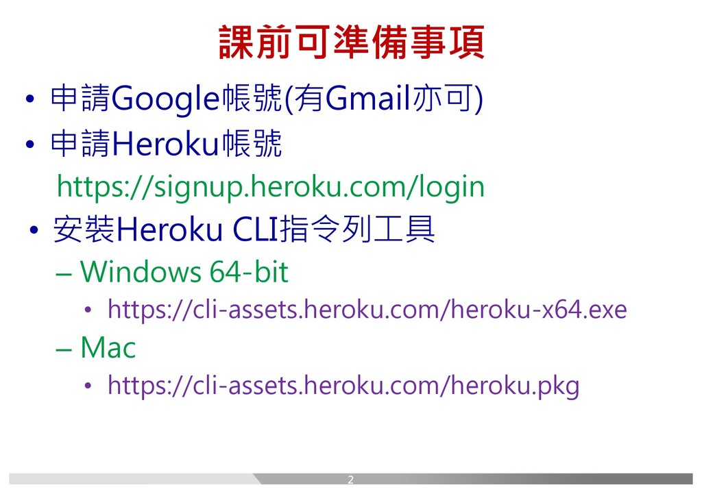 課前可準備事項 • 申請Google帳號(有Gmail亦可) • 申請Heroku帳號 https://signup.heroku.com/login • 安裝Heroku CLI指令列工具 –