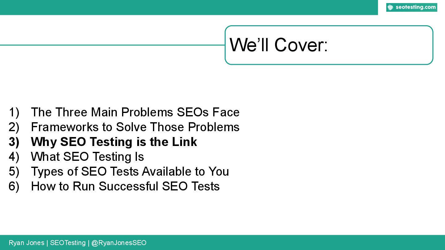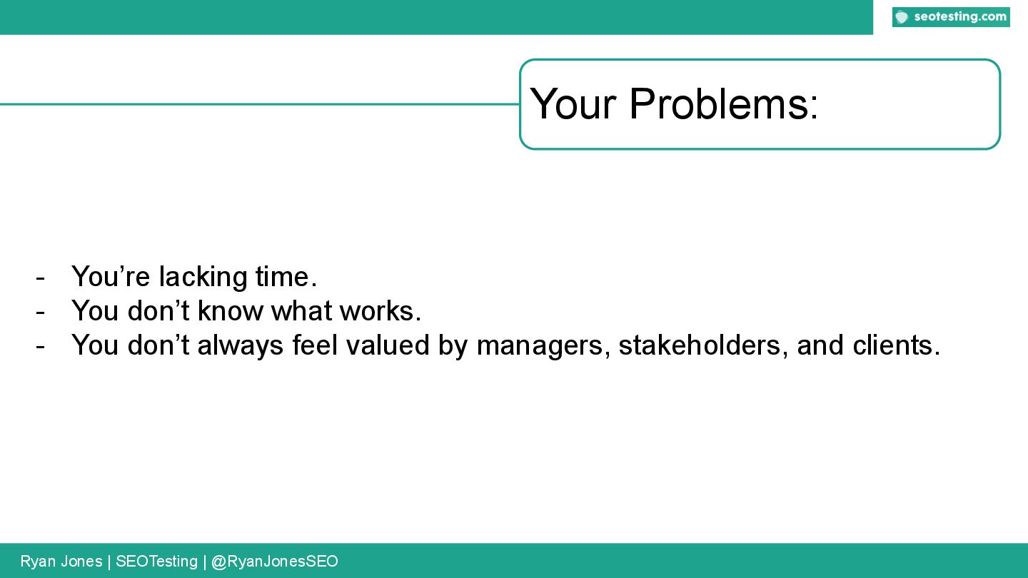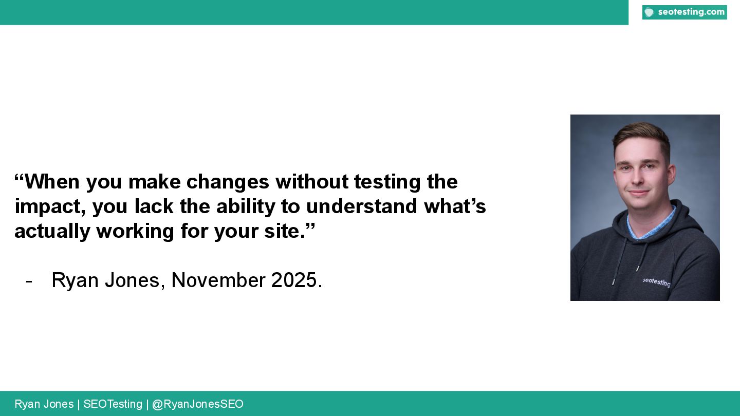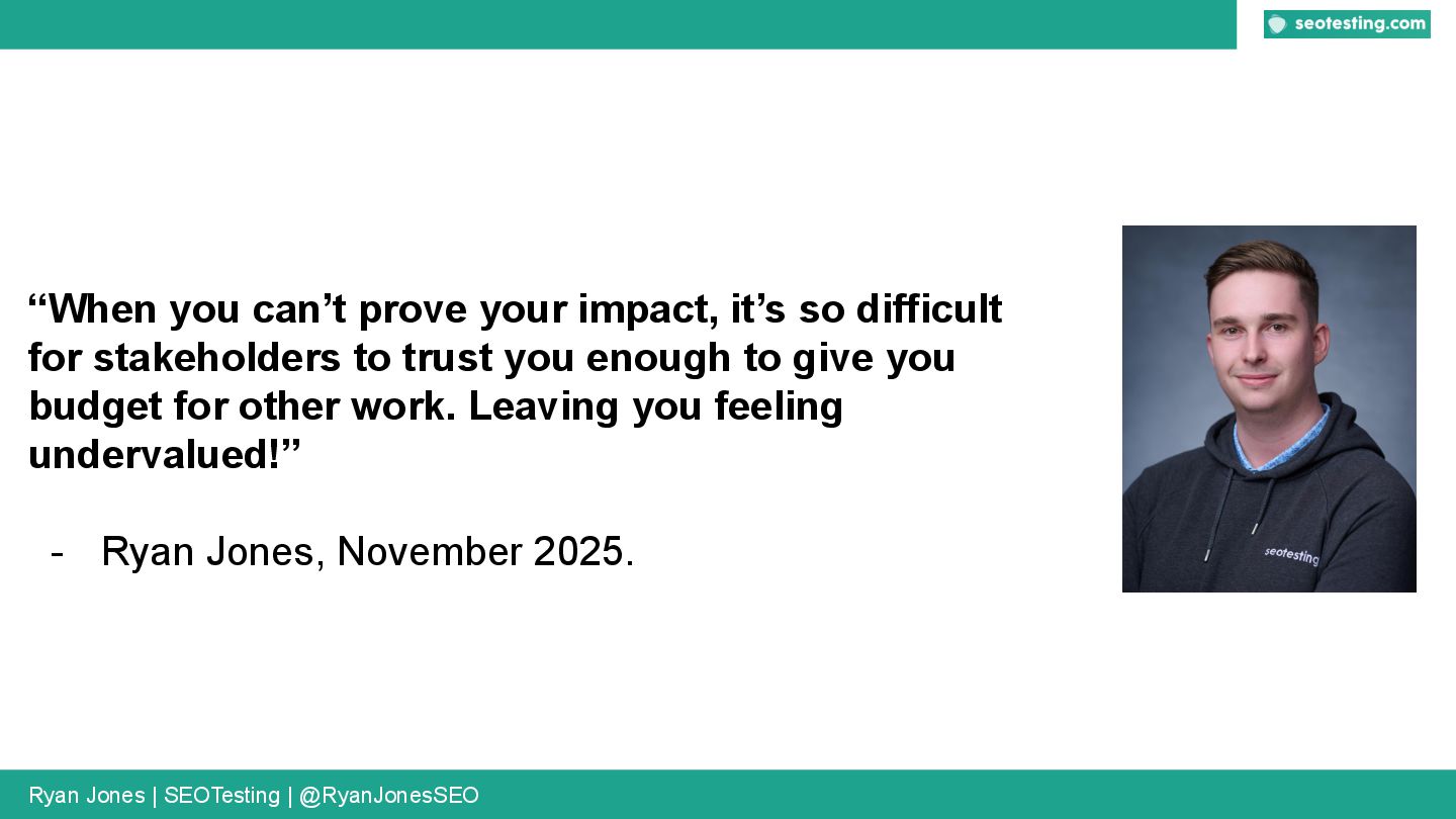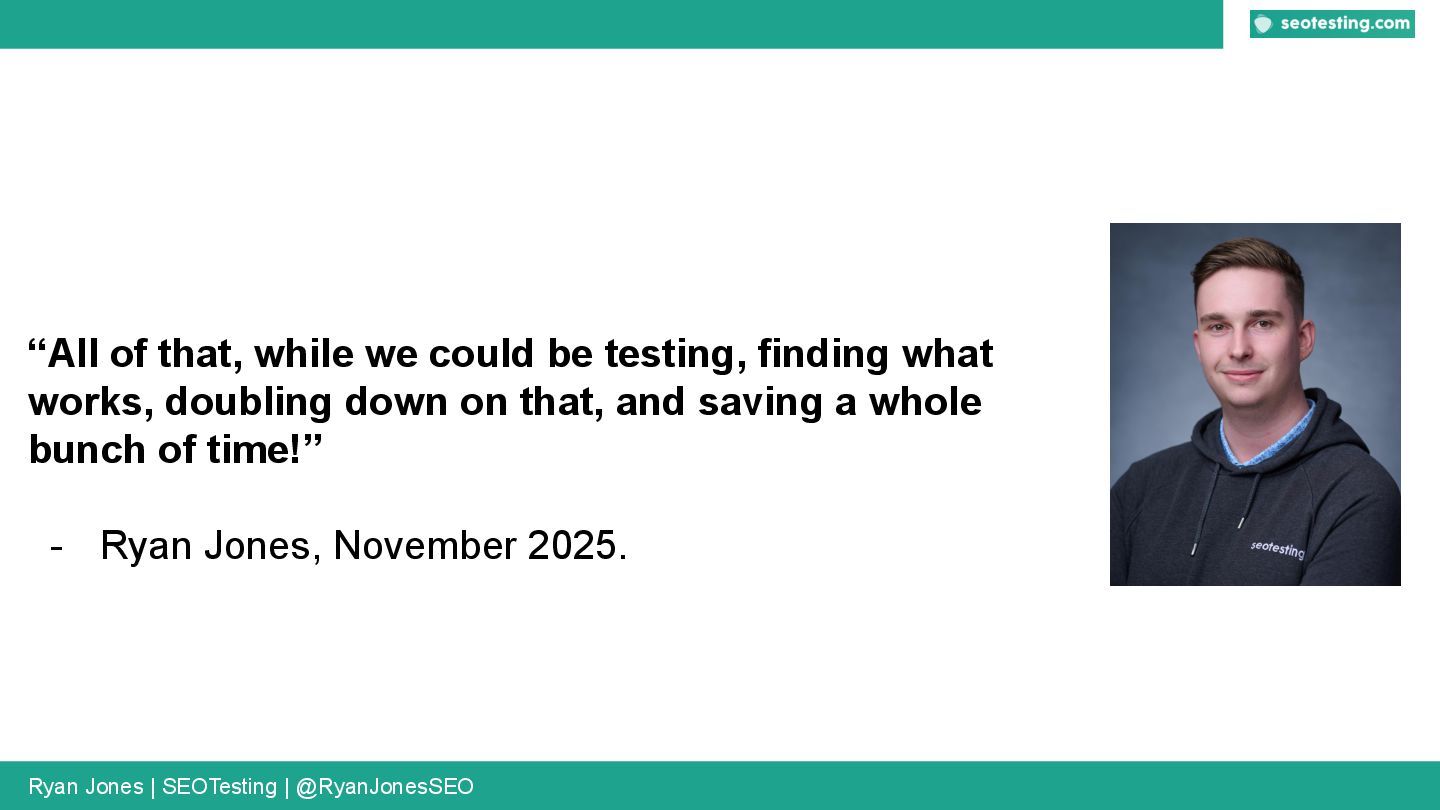 In this 30-minute webinar, Ryan Jones (Marketing Manager at SEOTesting) walks through the core challenges most SEOs face — lack of time, uncertainty about what works, and difficulty proving value — and shows how SEO testing can solve them.
