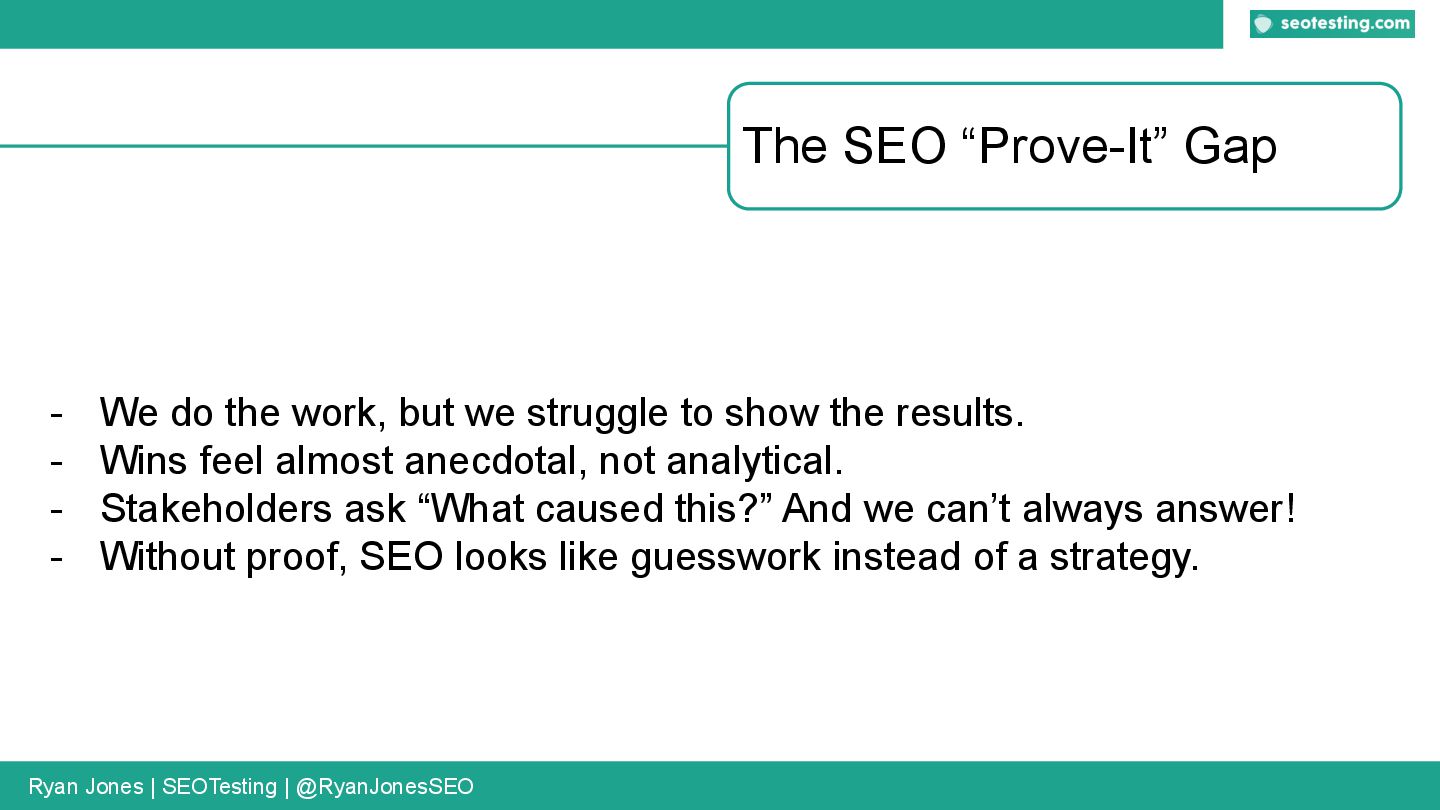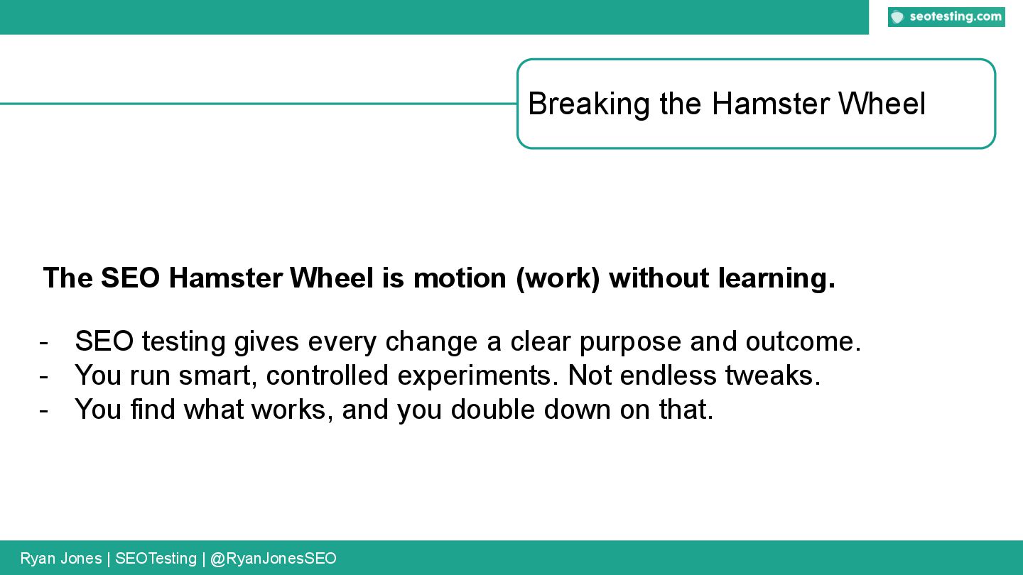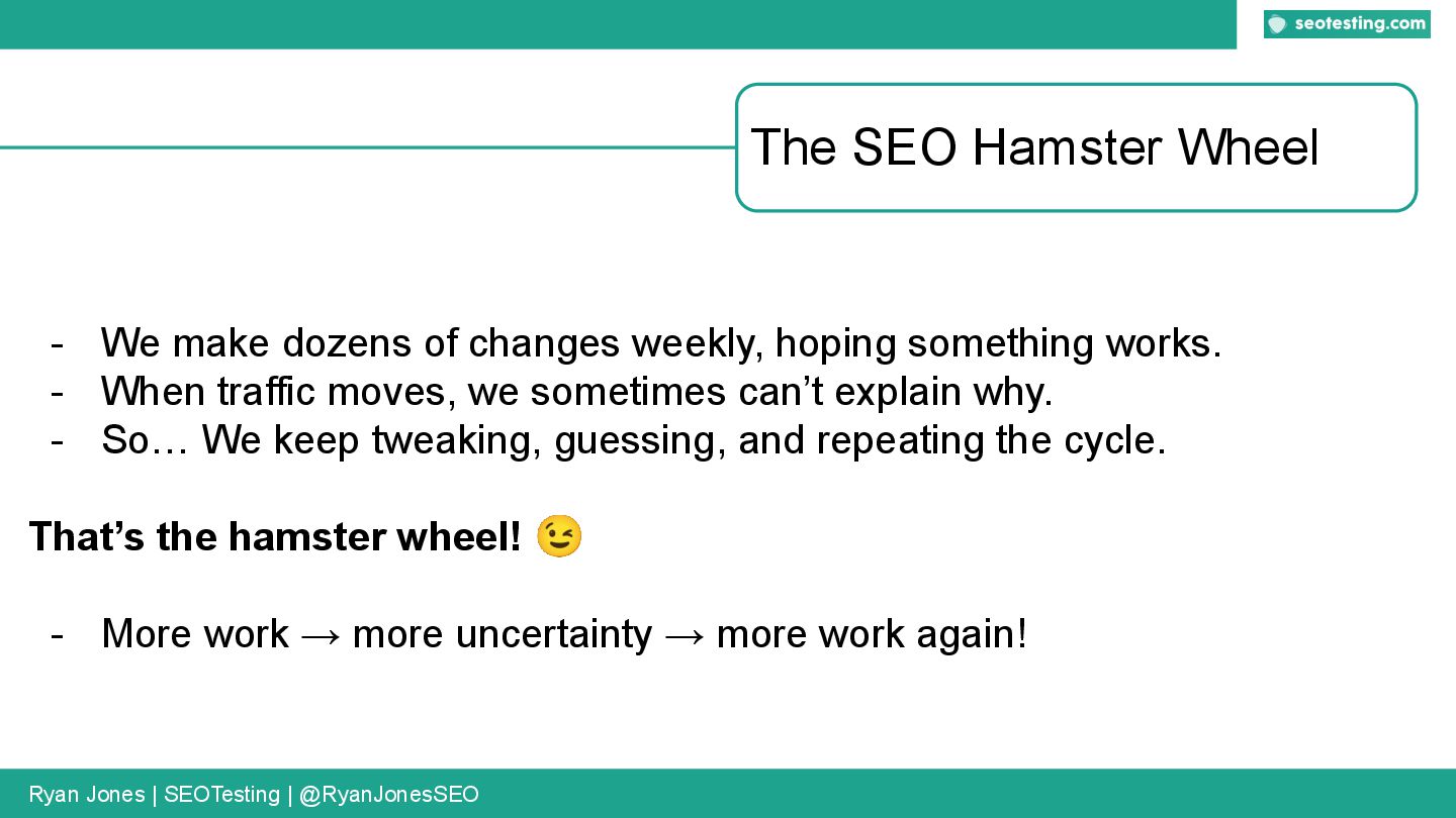 The presentation introduces three key frameworks — the SEO Hamster Wheel, the SEO Guesswork Tax, and the Prove-It Gap — that explain why traditional SEO work often leads to motion without learning. Ryan then demonstrates how data-driven experimentation helps teams escape the cycle, prove impact, and scale successful tactics.