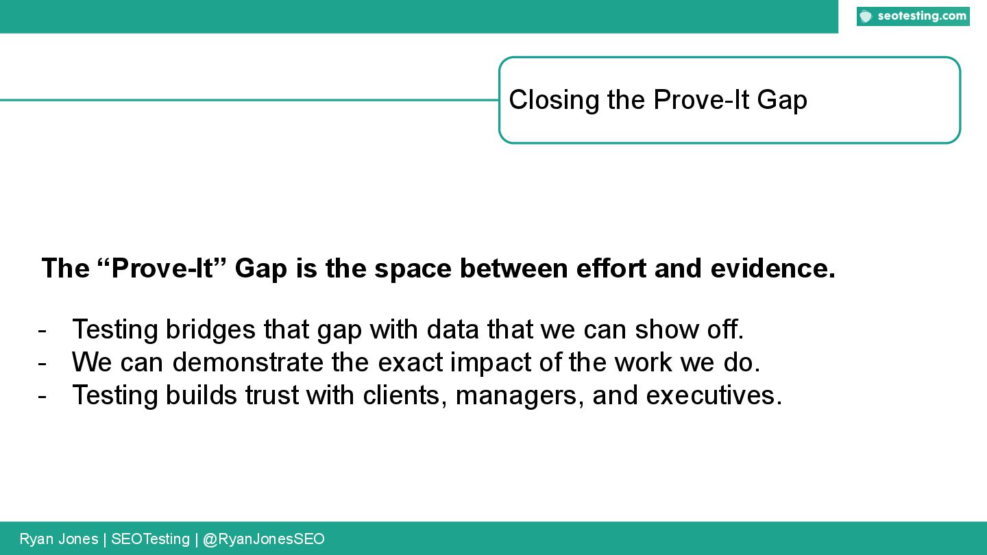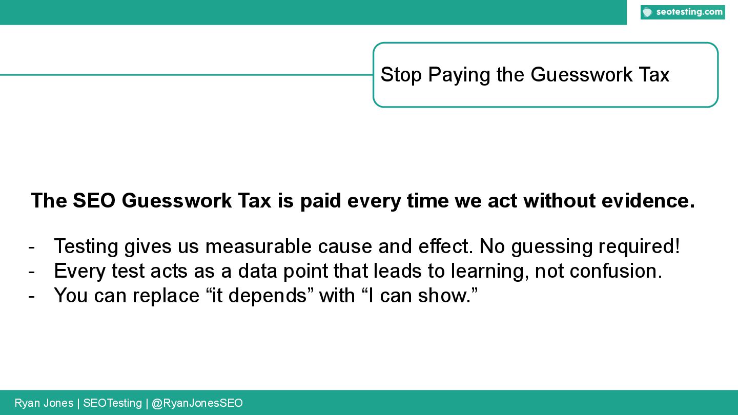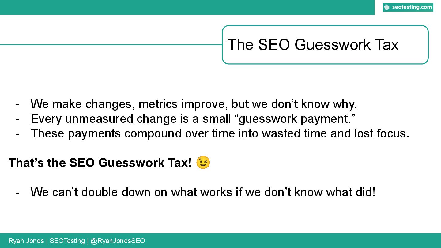 The presentation introduces three key frameworks — the SEO Hamster Wheel, the SEO Guesswork Tax, and the Prove-It Gap — that explain why traditional SEO work often leads to motion without learning. Ryan then demonstrates how data-driven experimentation helps teams escape the cycle, prove impact, and scale successful tactics.