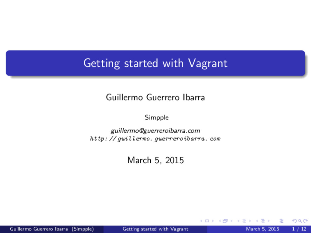 Easy to use Multiplatform Compatible with multiple virtualization software: VirtualBox / VMware / Parallels Snapshots Guillermo Guerrero Ibarra (Simpple) Getting started with Vagrant March 5, 2015 3 / 12