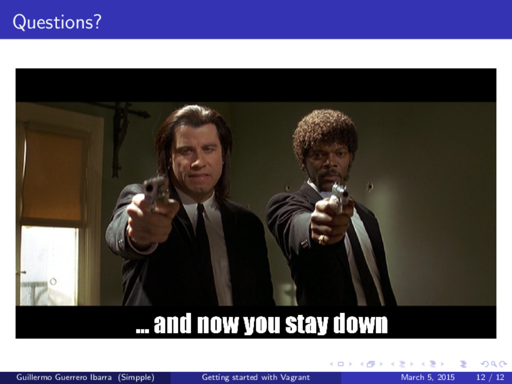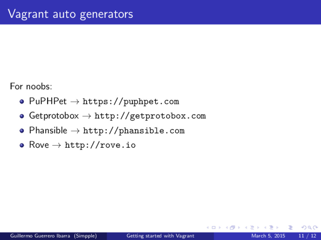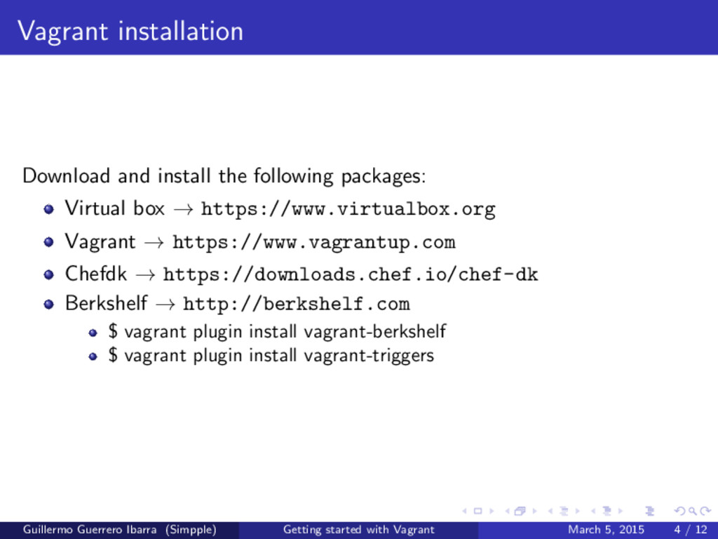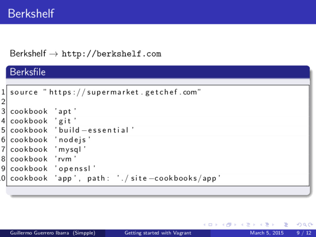 supermarket . g e t c h e f . com” 2 3 cookbook ’ apt ’ 4 cookbook ’ g i t ’ 5 cookbook ’ build −e s s e n t i a l ’ 6 cookbook ’ nodejs ’ 7 cookbook ’ mysql ’ 8 cookbook ’ rvm ’ 9 cookbook ’ o p e n s s l ’ 10 cookbook ’ app ’ , path : ’ ./ s i t e −cookbooks /app ’ Guillermo Guerrero Ibarra (Simpple) Getting started with Vagrant March 5, 2015 9 / 12